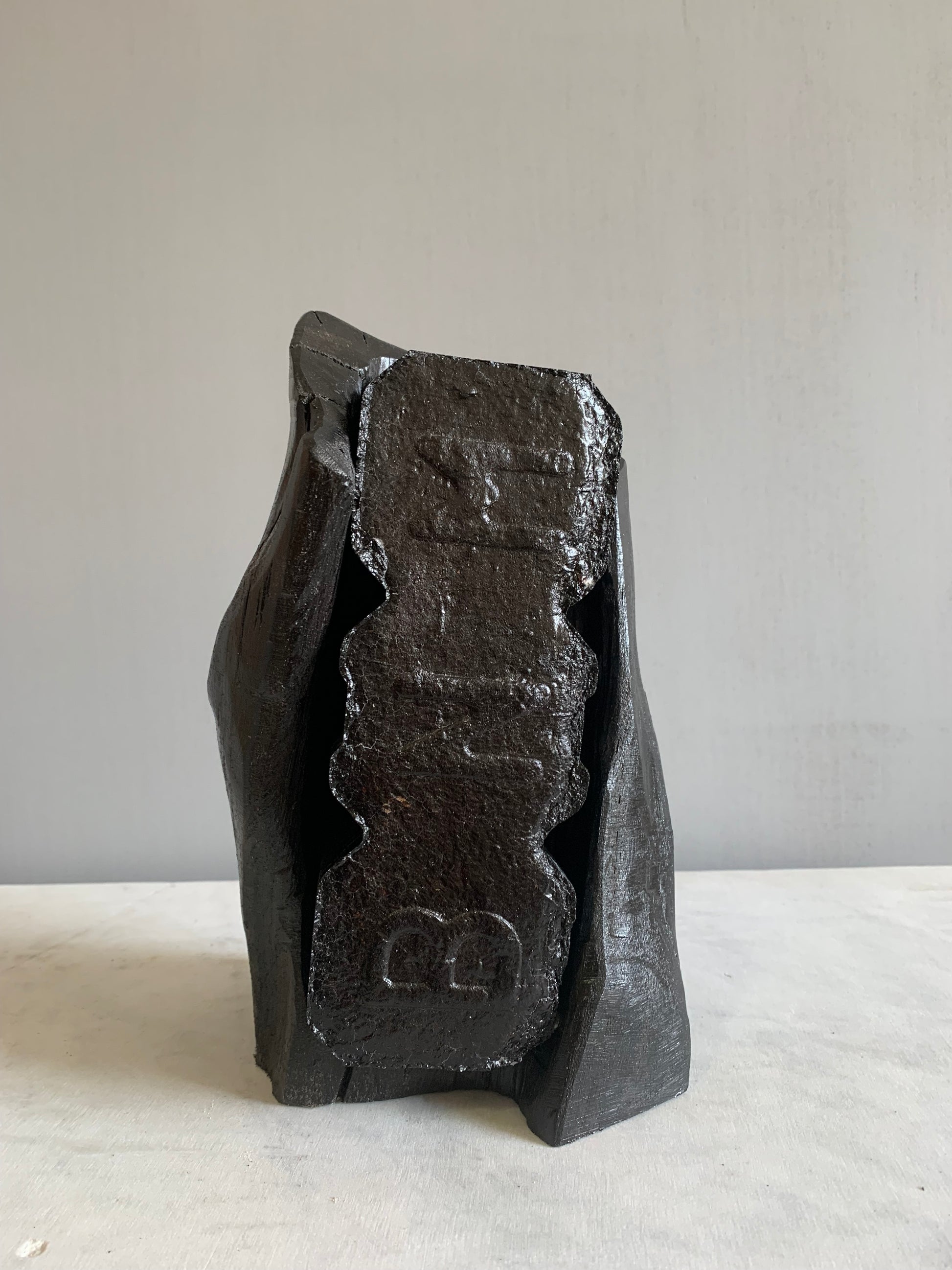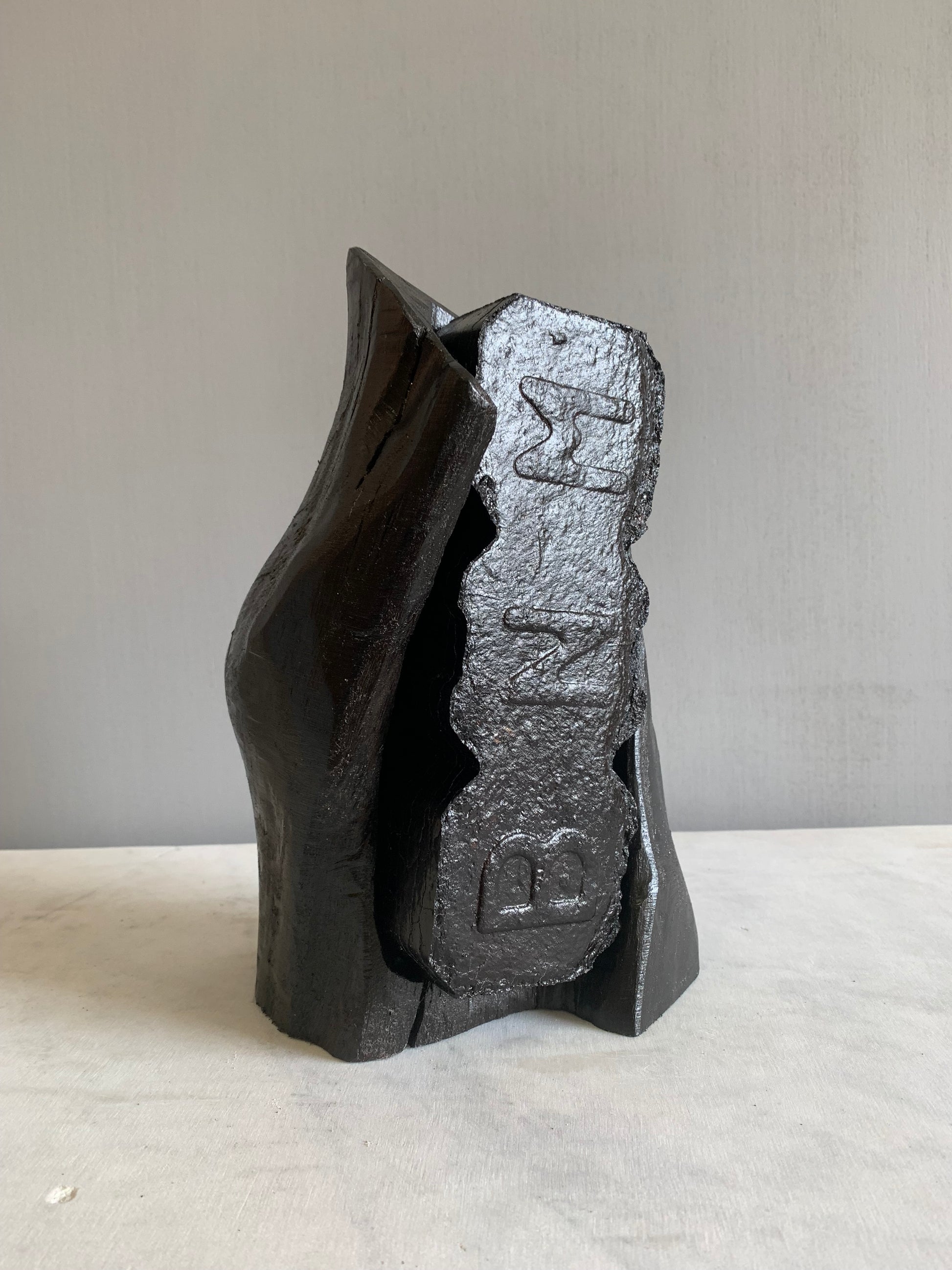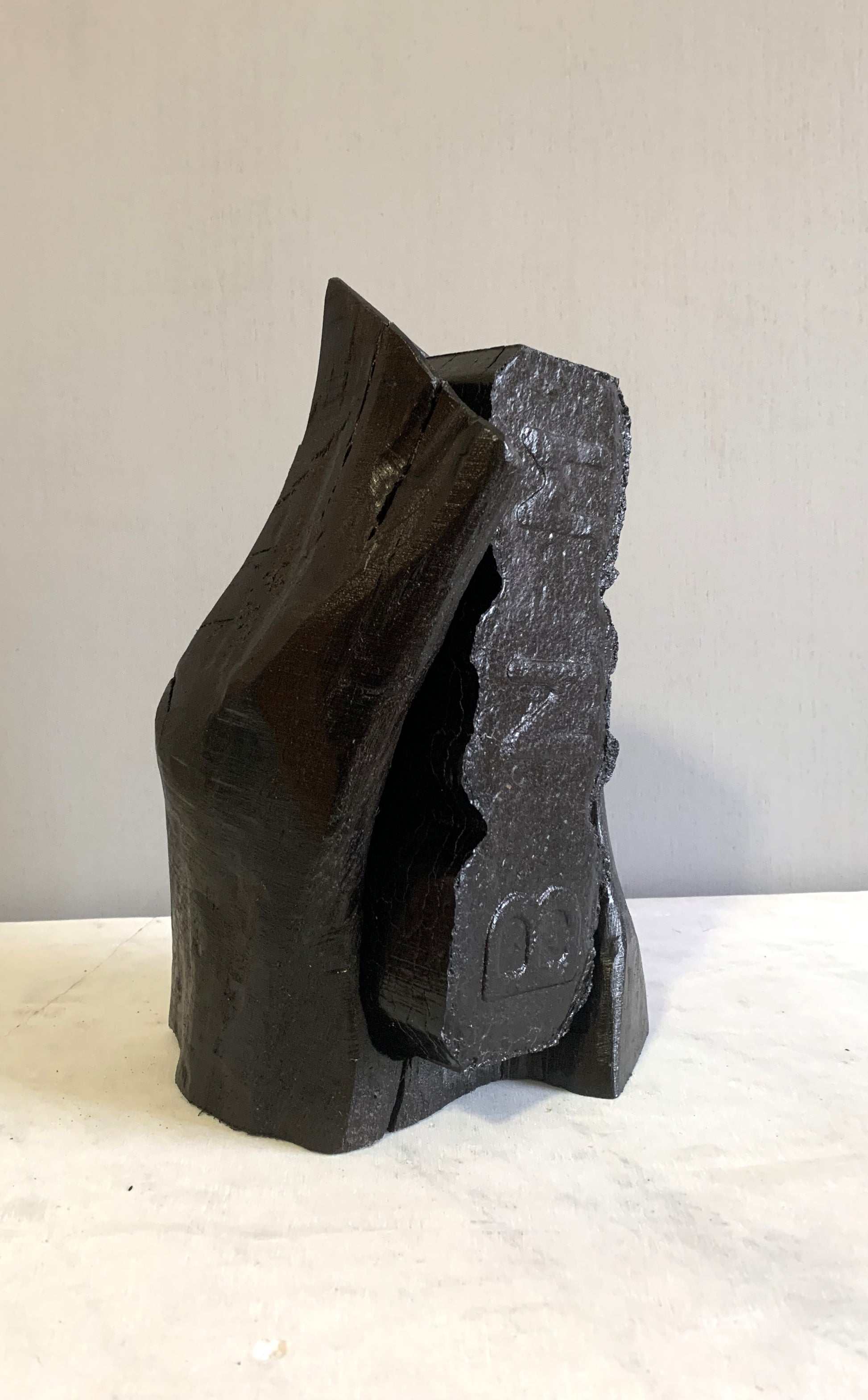 An ironic story of an iconic Irish Bord na Mona peat briquette enveloped in a piece of bog oak thousands of years old . Thousands of years ago it was this peat that preserved this oak from extinction but now the peat briquette is extinct. With the termination of turf cutting and peat harvesting, bog oak and bog peat will again lie together for millennia.