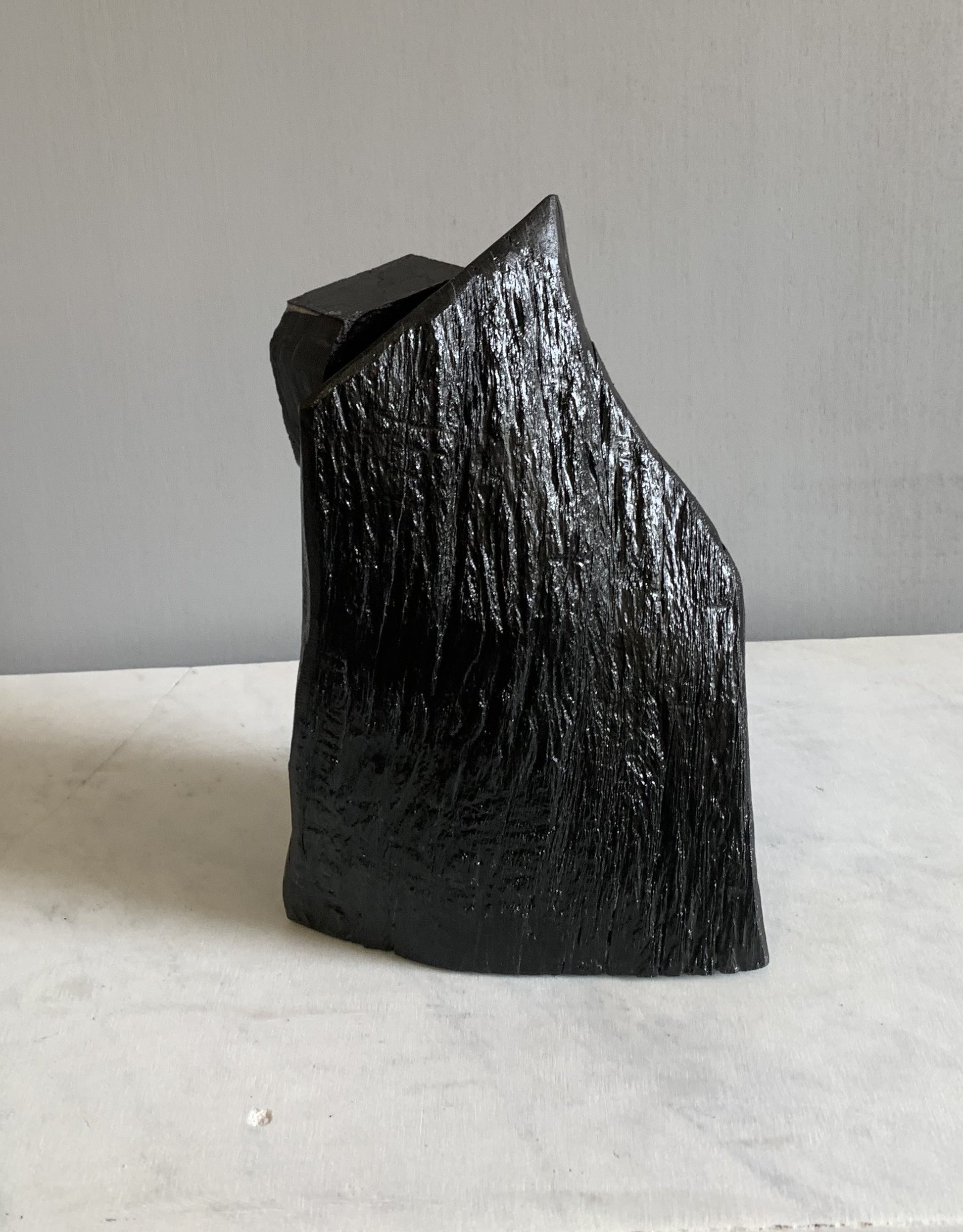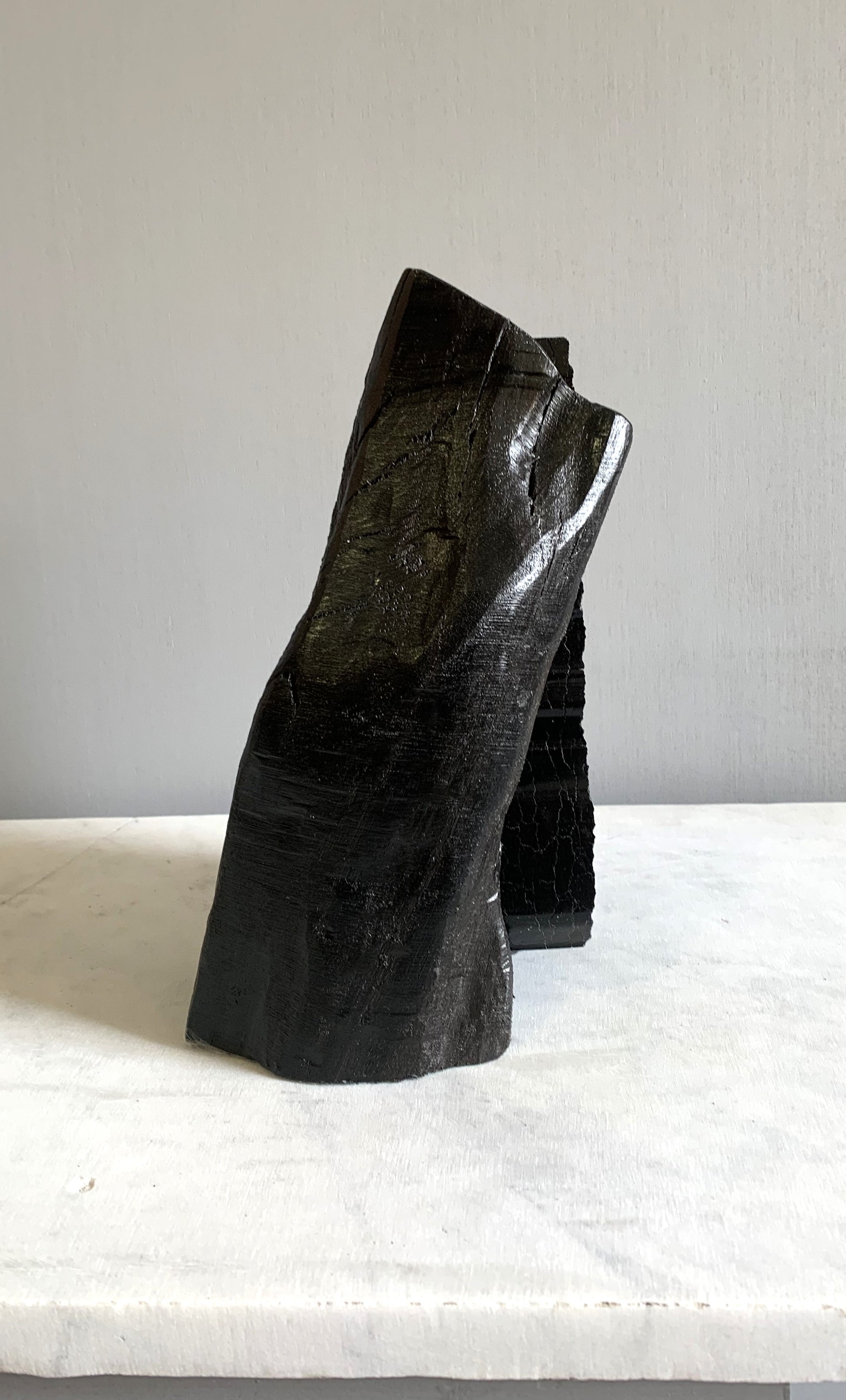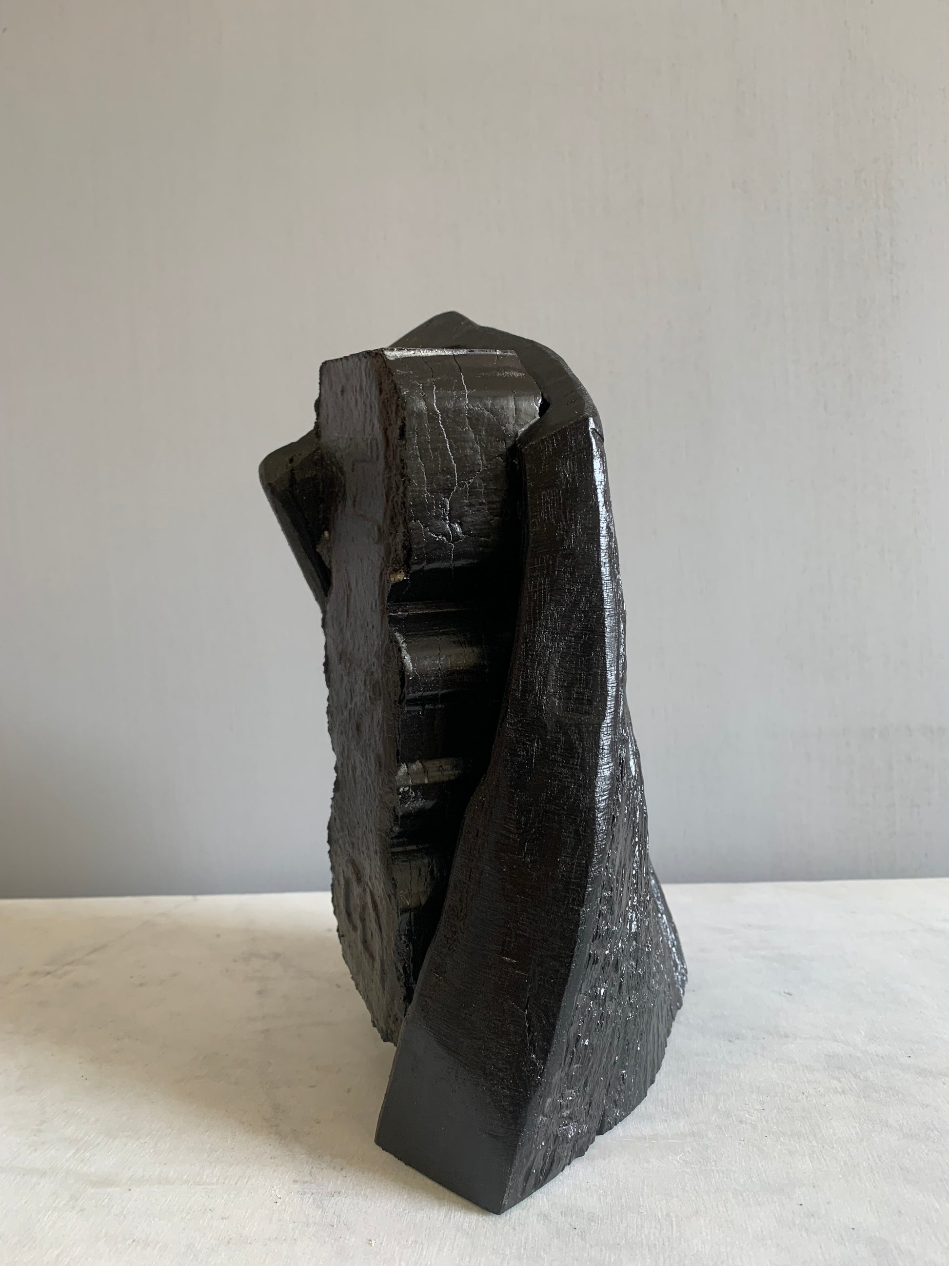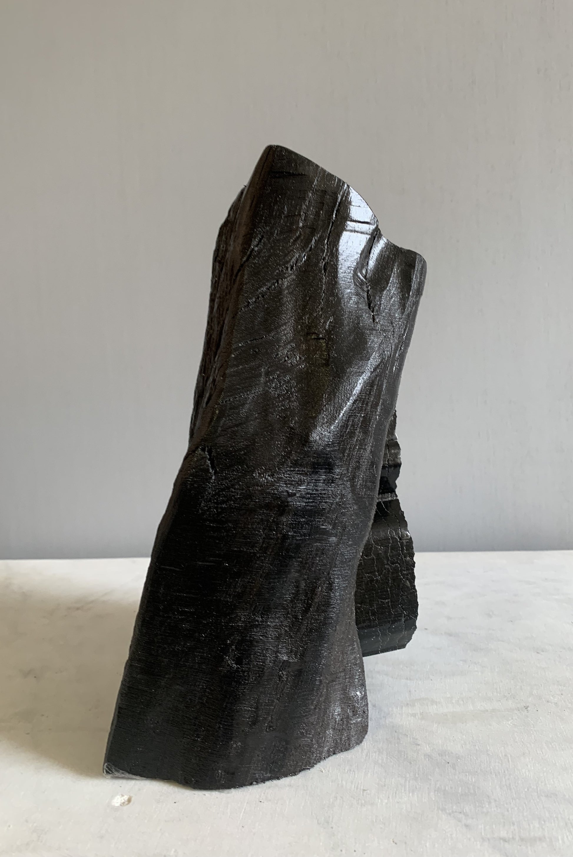 An ironic story of an iconic Irish Bord na Mona peat briquette enveloped in a piece of bog oak thousands of years old . Thousands of years ago it was this peat that preserved this oak from extinction but now the peat briquette is extinct. With the termination of turf cutting and peat harvesting, bog oak and bog peat will again lie together for millennia.