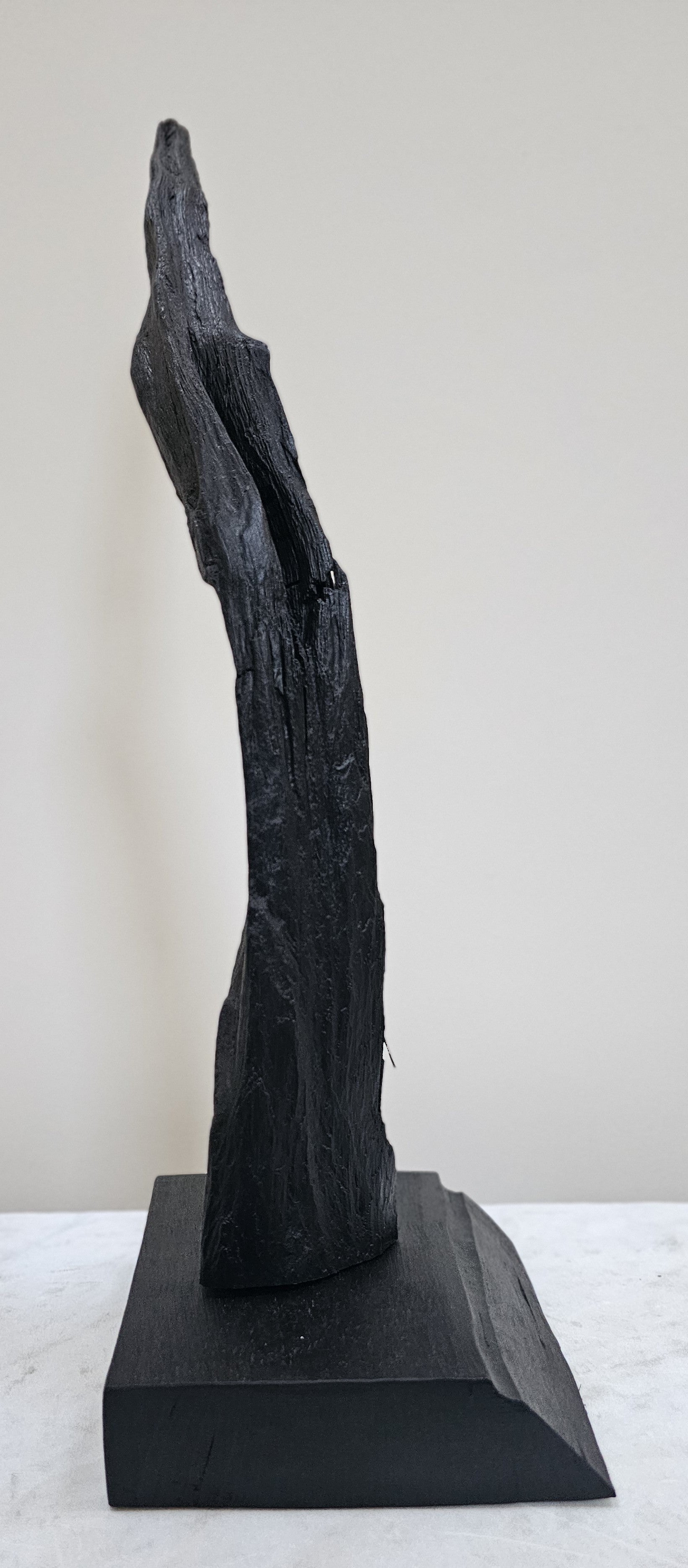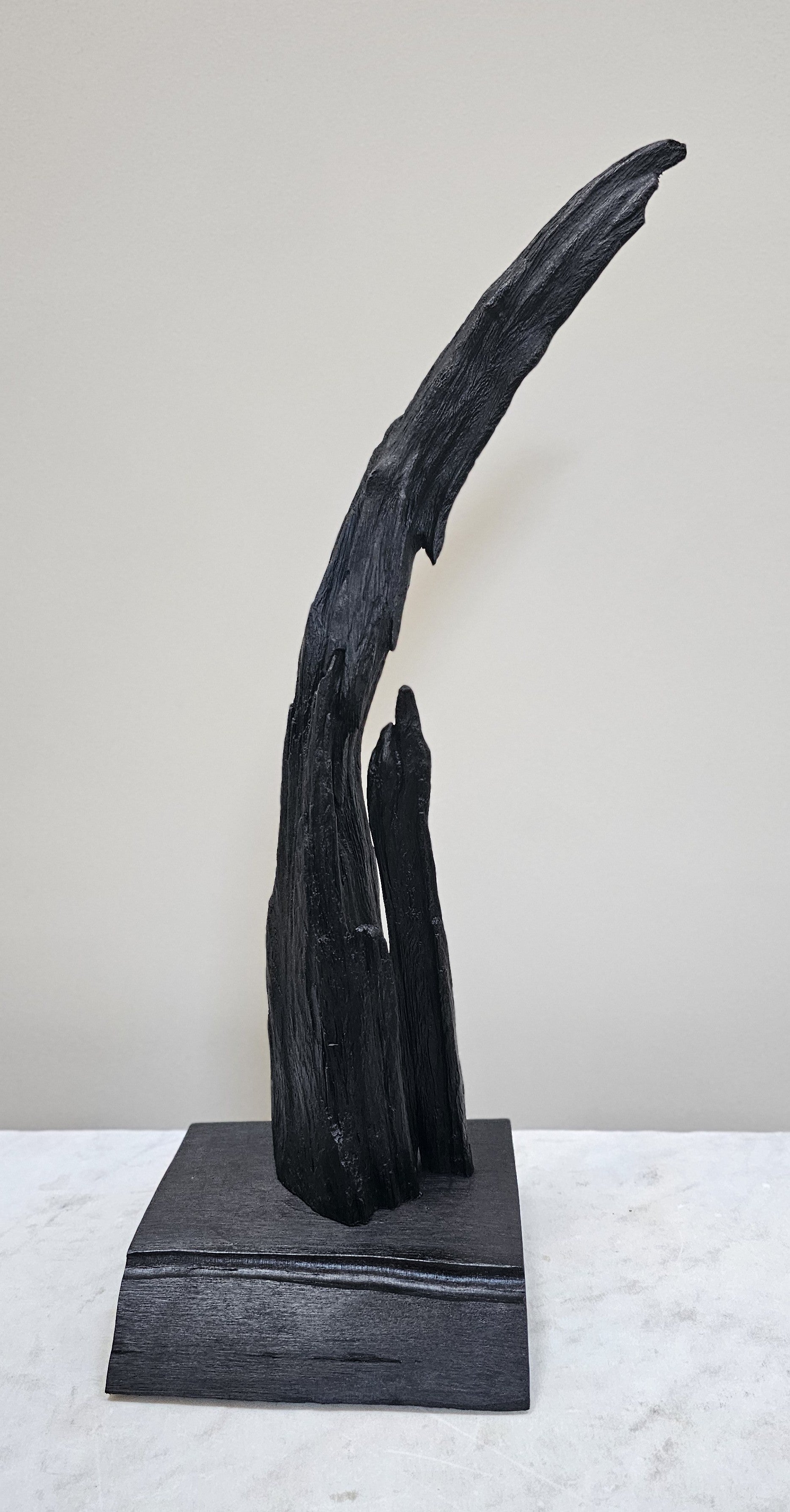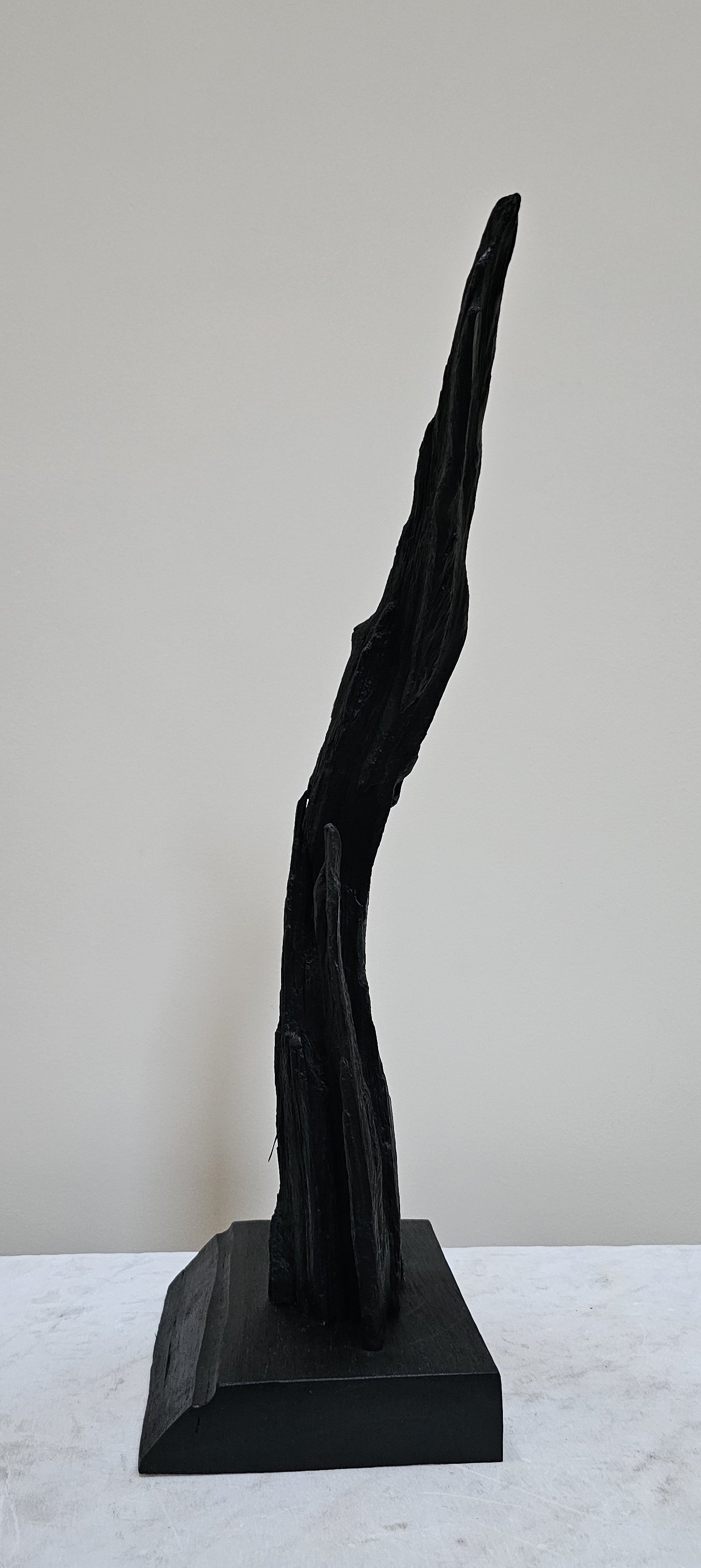 This cracked and fabulously shaped piece of bog oak was an offcut from a larger bough. It has managed to survive this long so I stripped out the decayed bark and wood back to sound oak to reveal the natural grain and this incredible shape. I mounted it on a smooth sanded bog oak base which highlights the rough texture of the original oak wood.