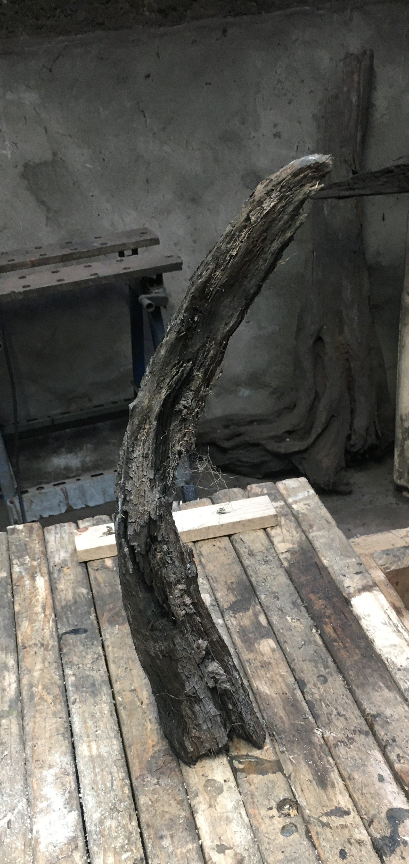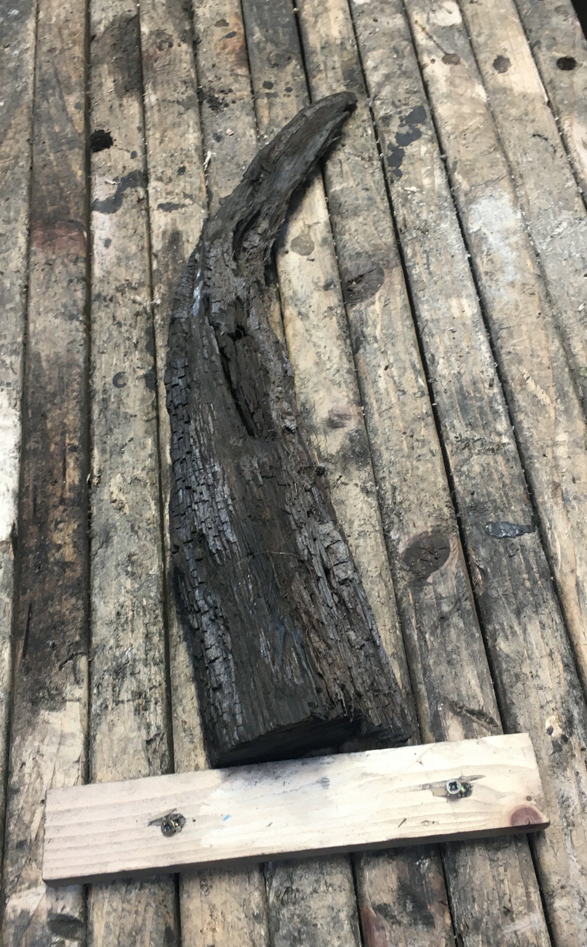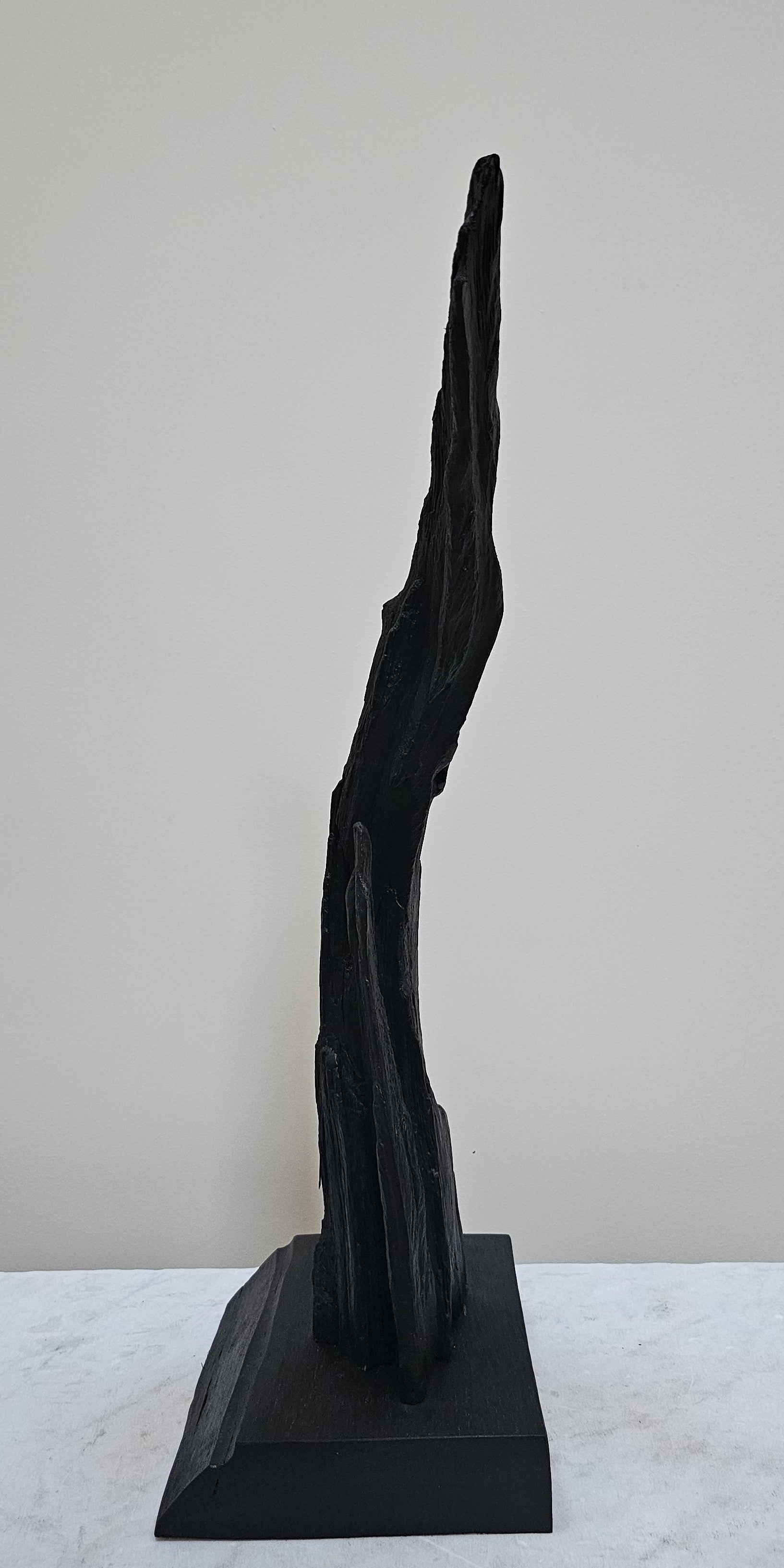 This cracked and fabulously shaped piece of bog oak was an offcut from a larger bough. It has managed to survive this long so I stripped out the decayed bark and wood back to sound oak to reveal the natural grain and this incredible shape. I mounted it on a smooth sanded bog oak base which highlights the rough texture of the original oak wood.