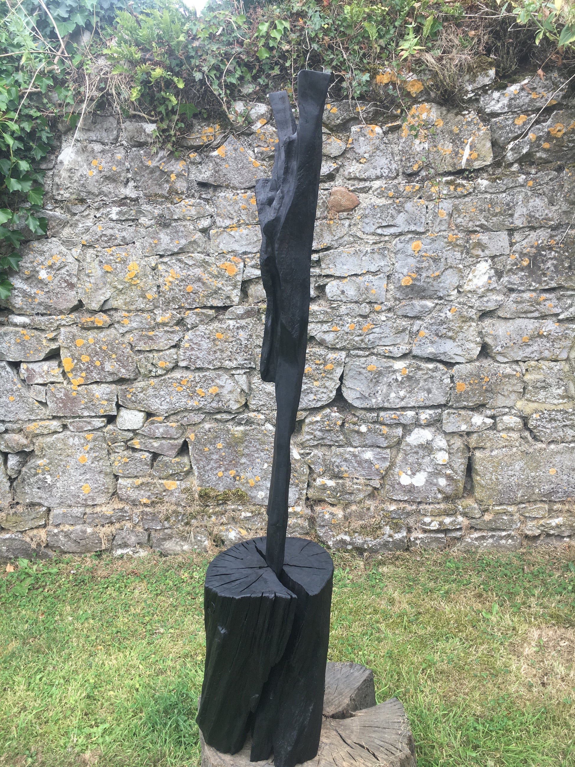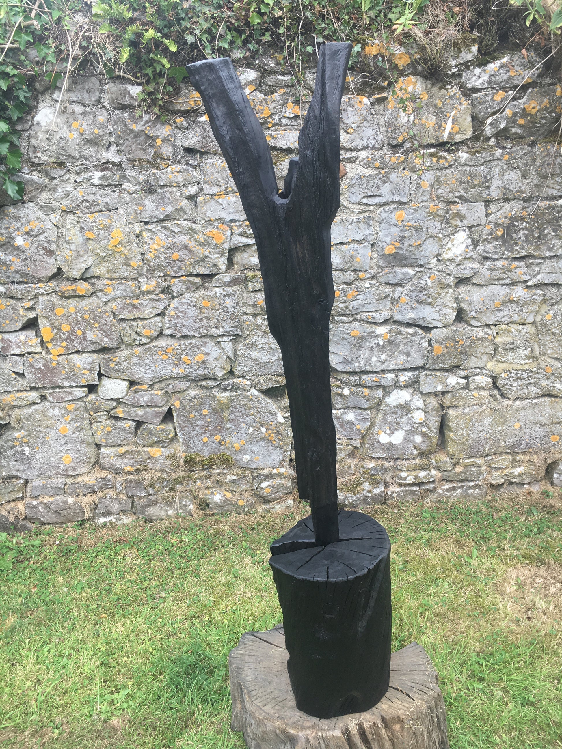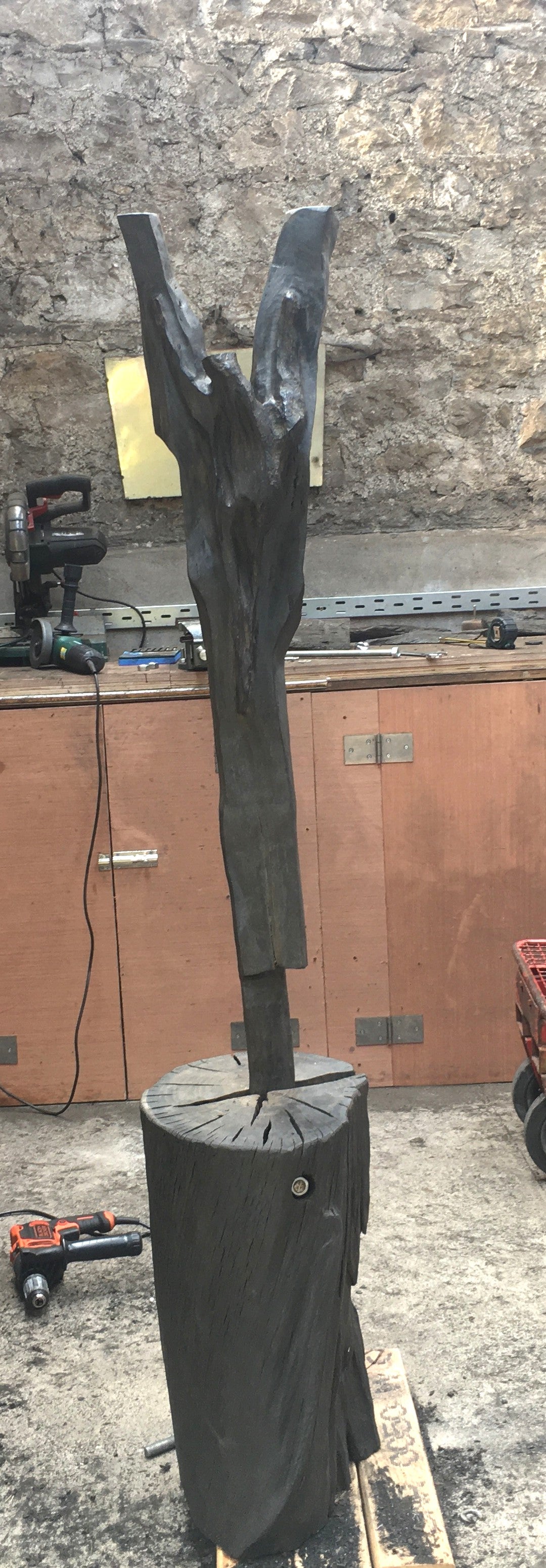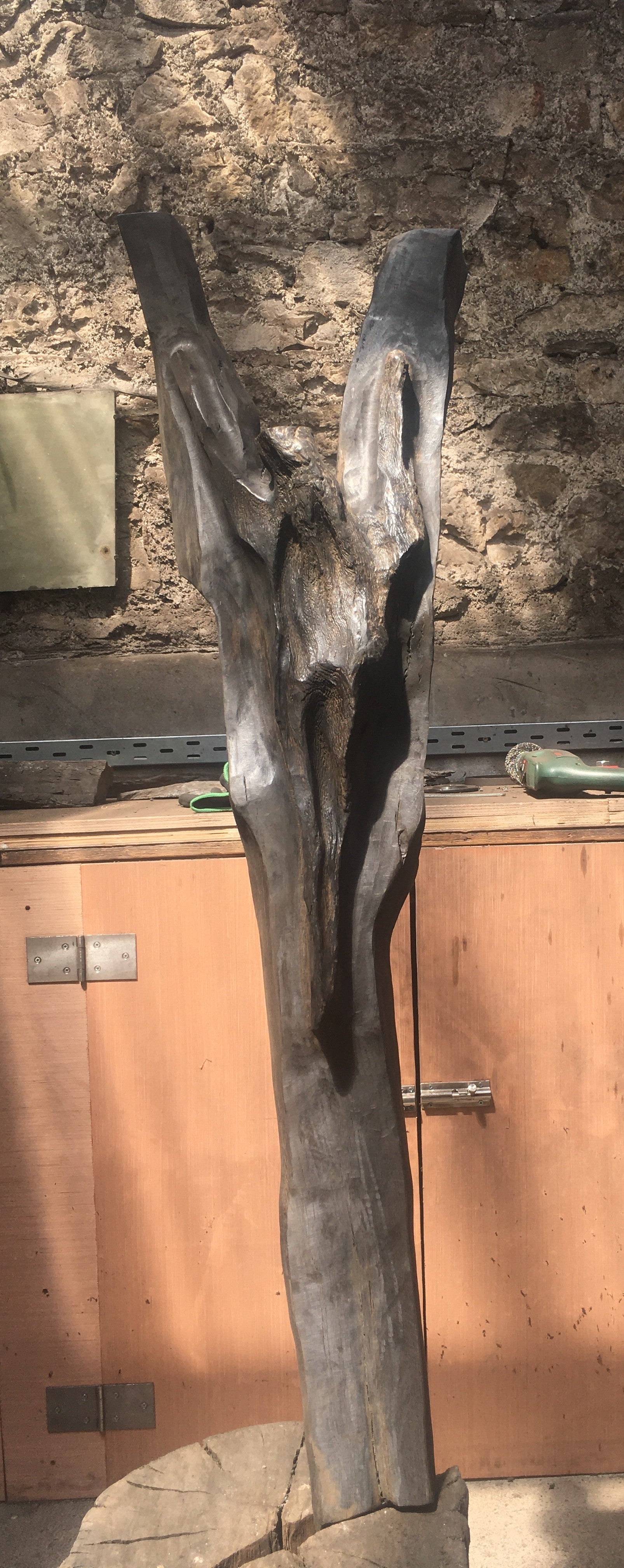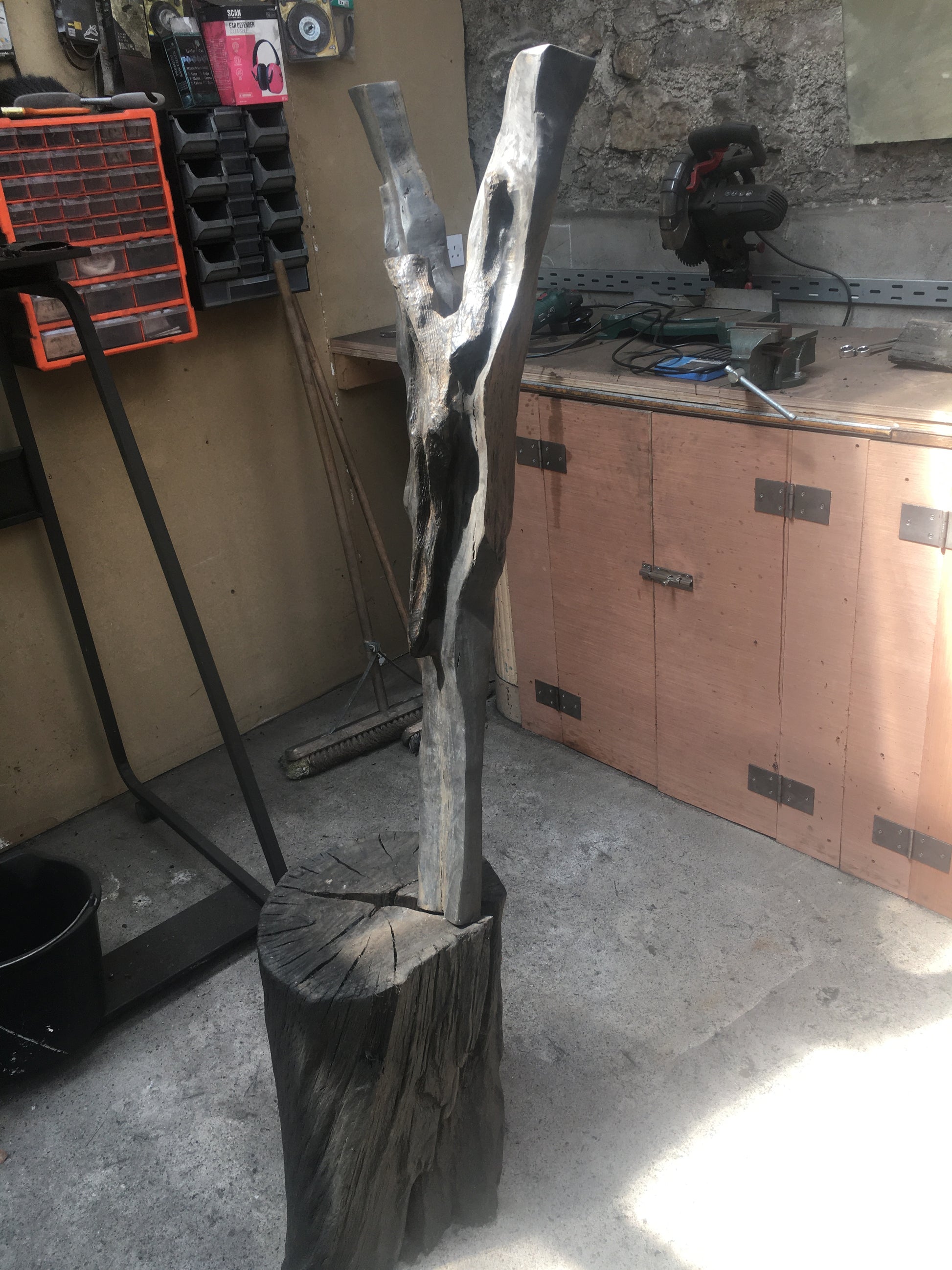 When I first saw this piece of bog oak I immediately saw the outline of Jesus hanging on the Cross - not the most orthodox shaped cross - more of a Y than a T shape! I left the natural outline of the body and the incredible existing wood grain as I found it and shaped the cross around this form. I had this amazing twisted bog oak bough in the workshop with its stunning cracks and a major split in the centre, The cross is inserted into the large split and is clamped tight into position with a concealed bolt in the bough. Over 2,000 years ago this bog oak was possibly a living tree in Laois at the time Jesus was crucified on the cross.