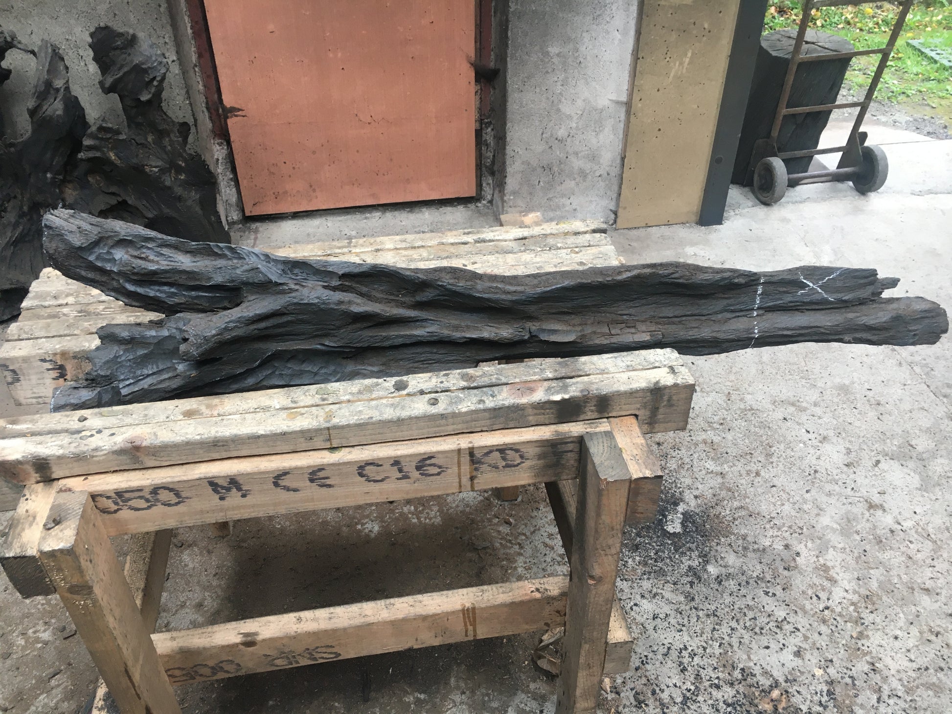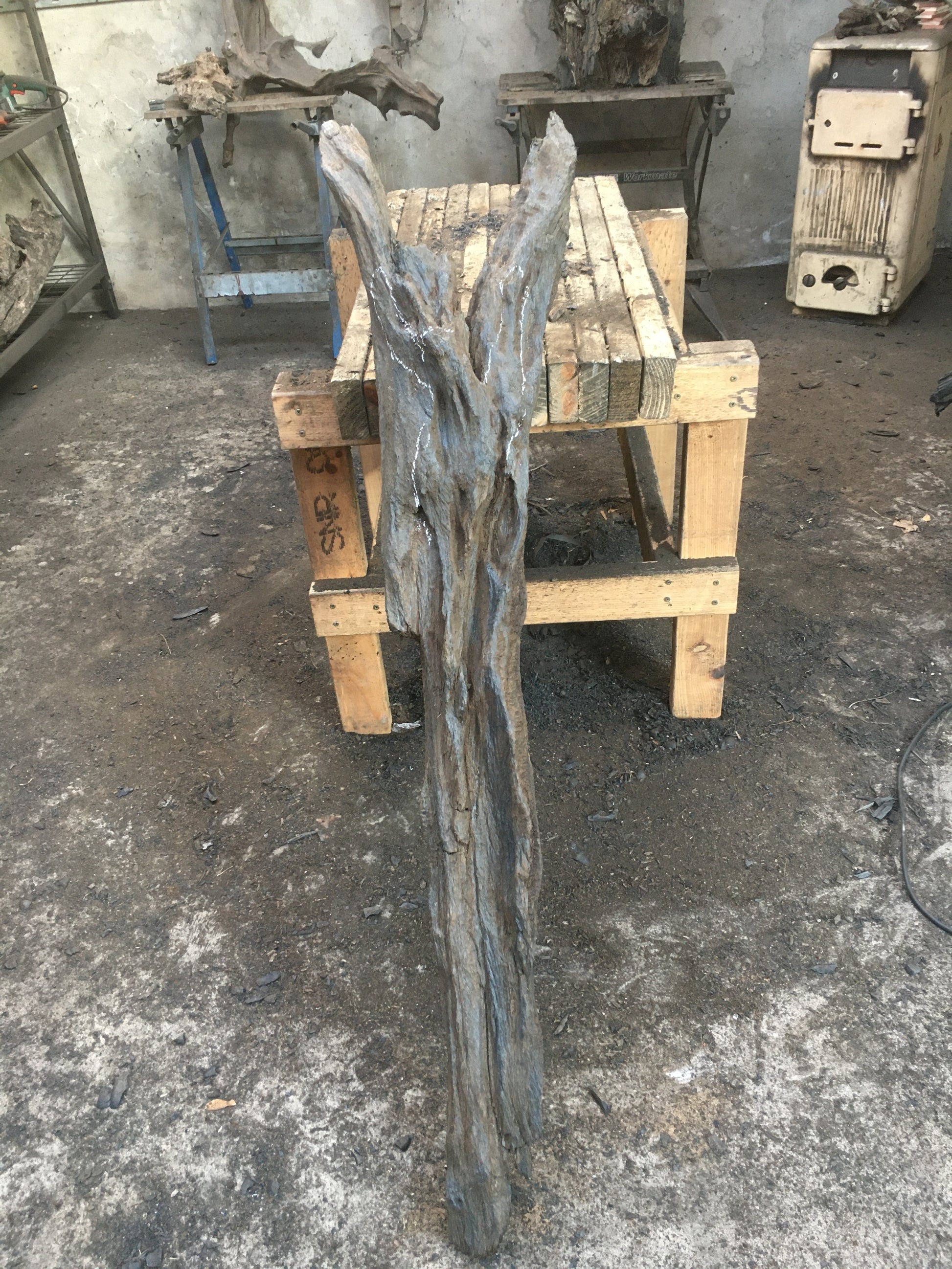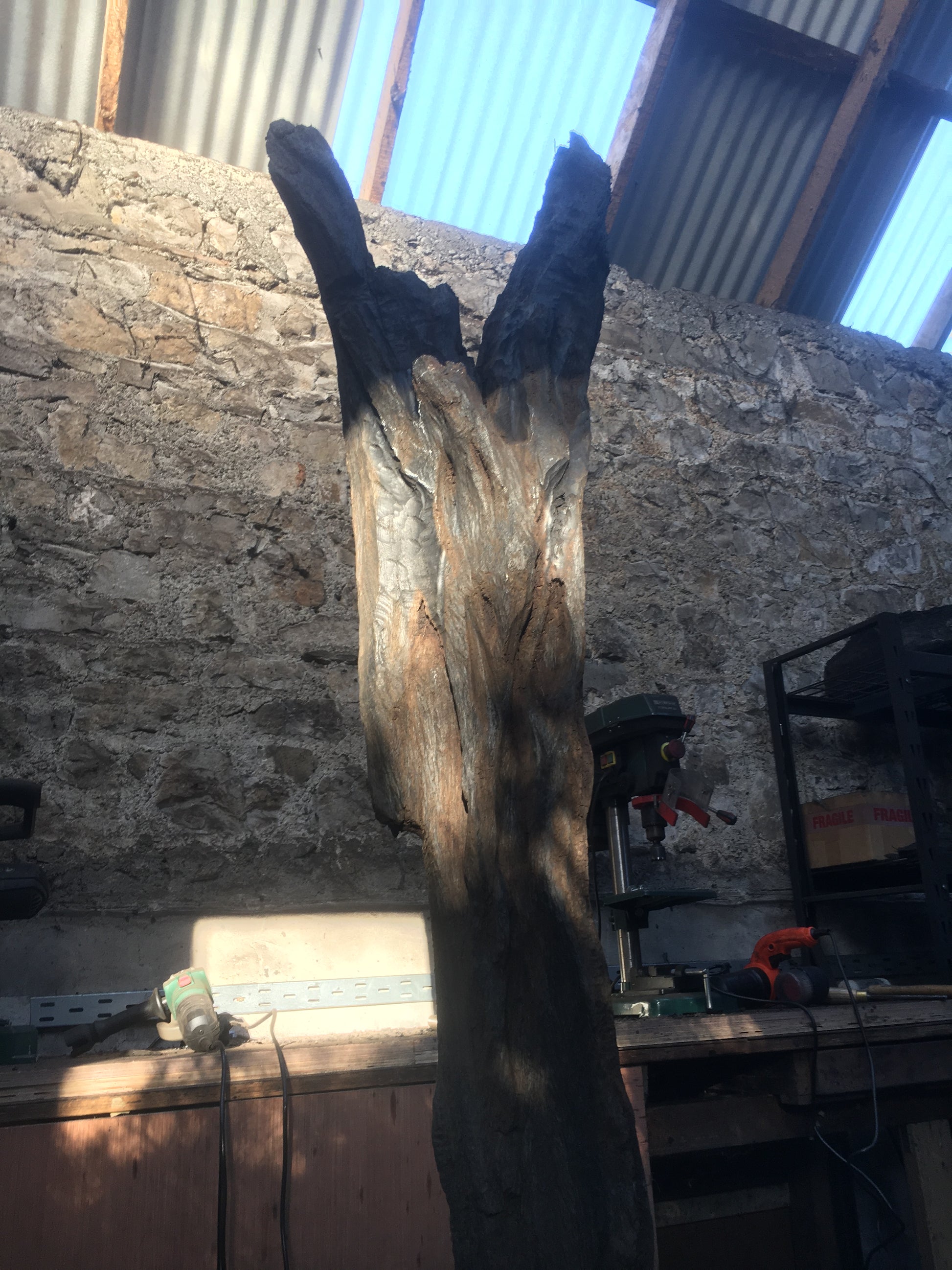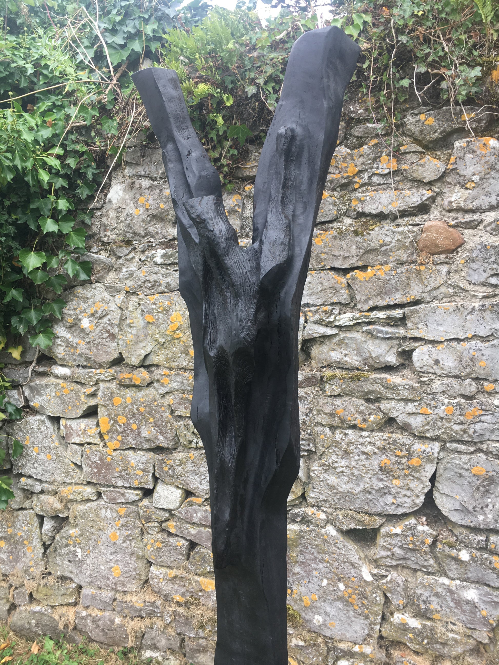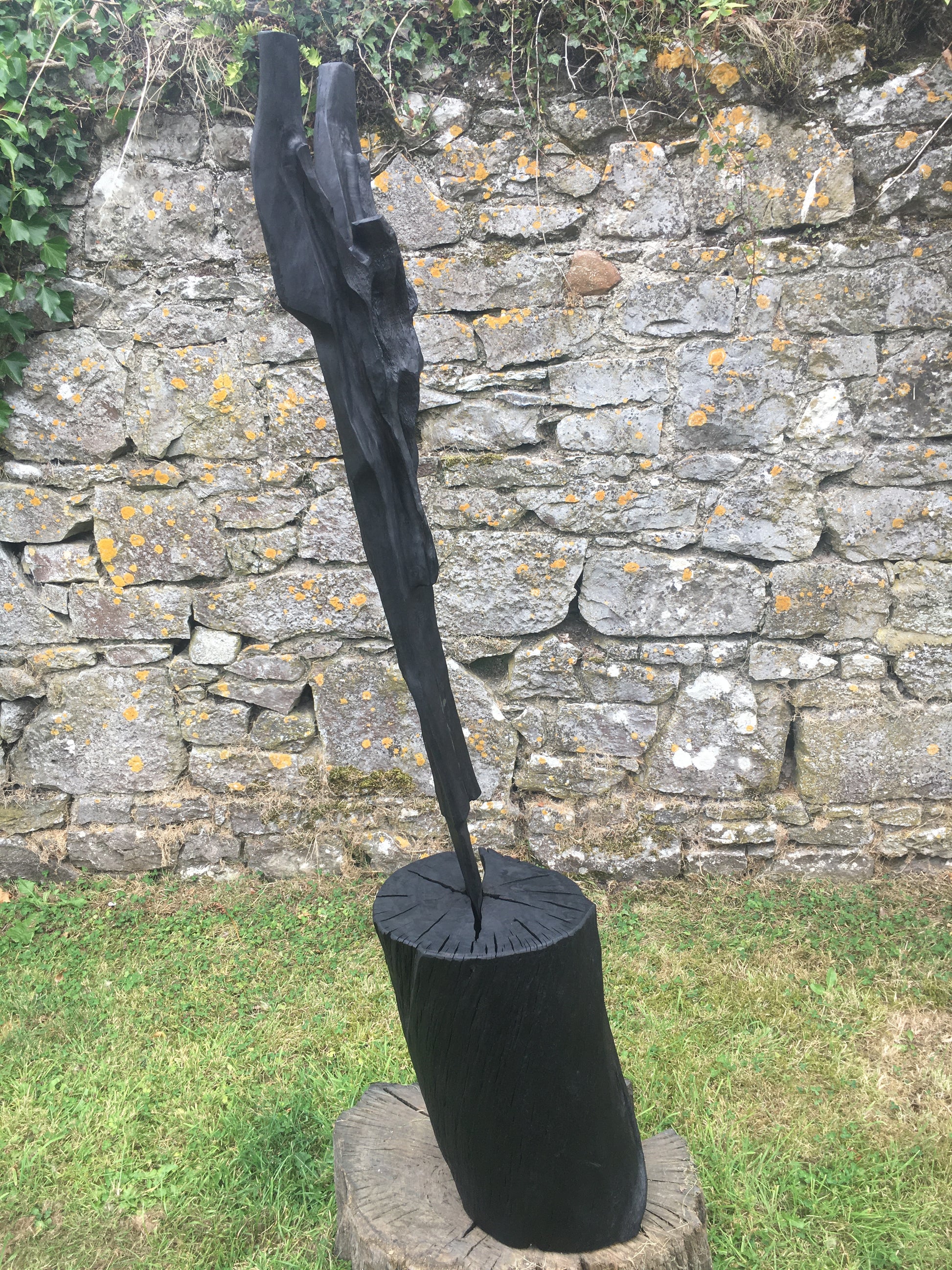 When I first saw this piece of bog oak I immediately saw the outline of Jesus hanging on the Cross - not the most orthodox shaped cross - more of a Y than a T shape! I left the natural outline of the body and the incredible existing wood grain as I found it and shaped the cross around this form. I had this amazing twisted bog oak bough in the workshop with its stunning cracks and a major split in the centre, The cross is inserted into the large split and is clamped tight into position with a concealed bolt in the bough. Over 2,000 years ago this bog oak was possibly a living tree in Laois at the time Jesus was crucified on the cross.