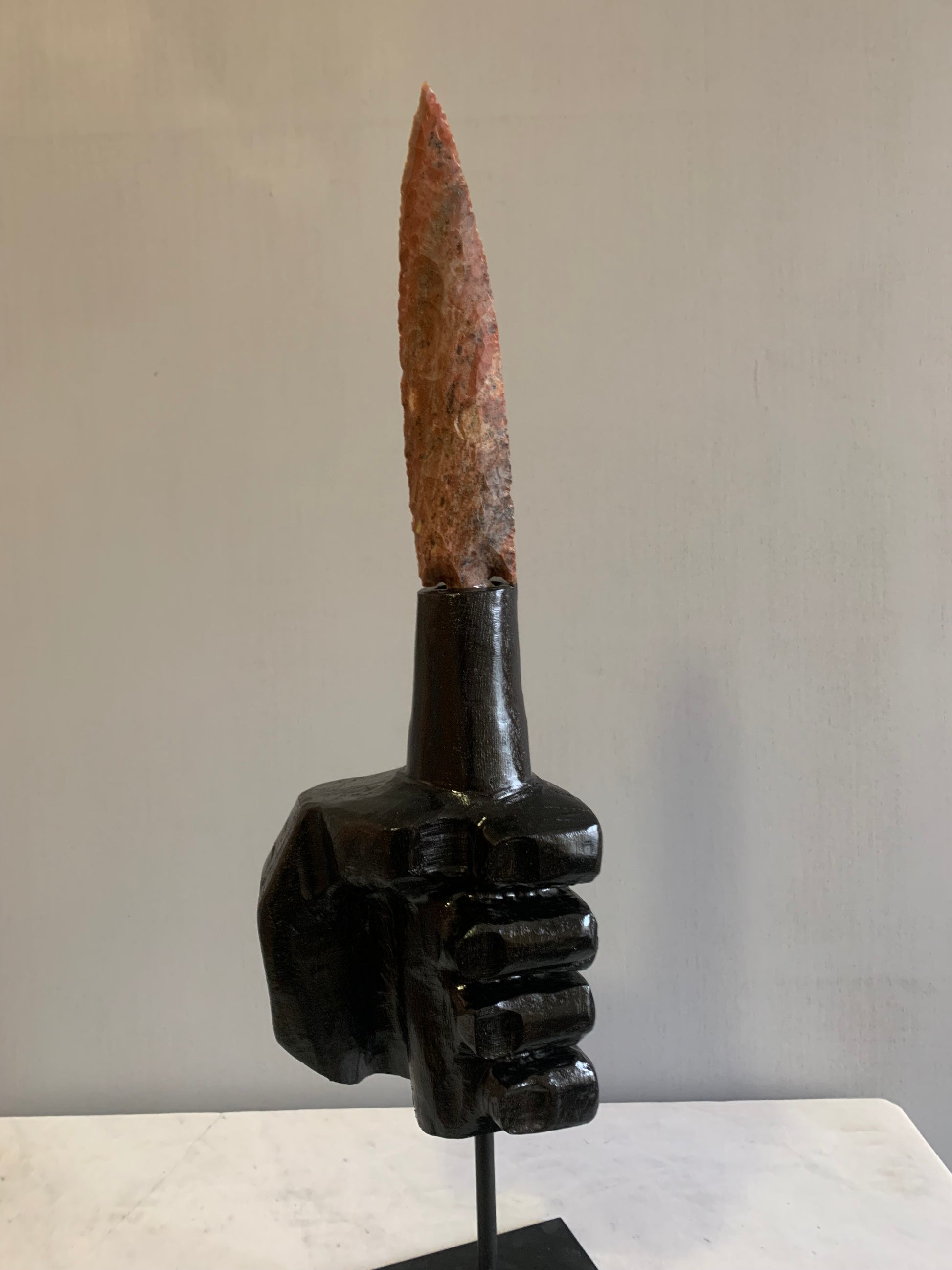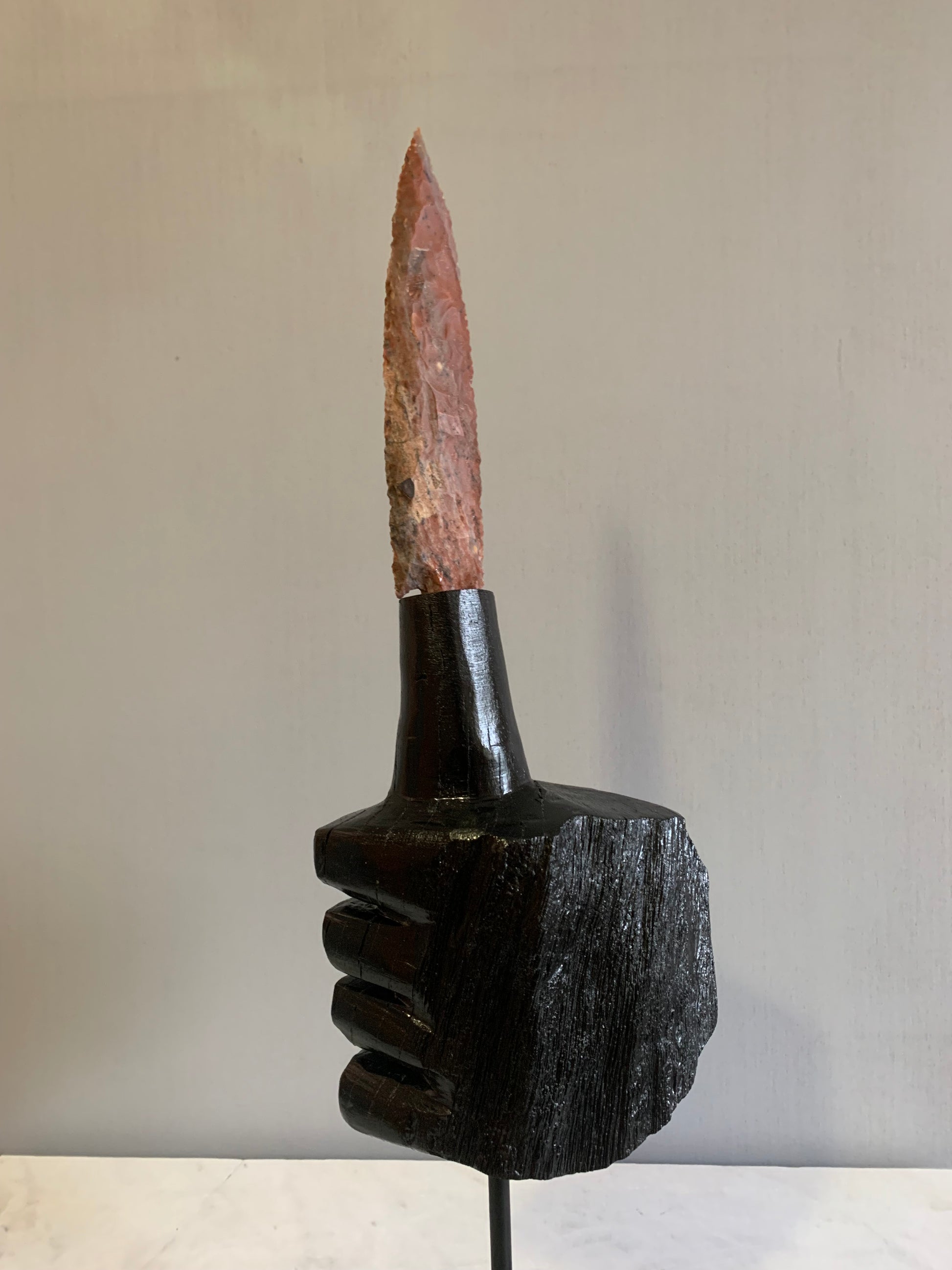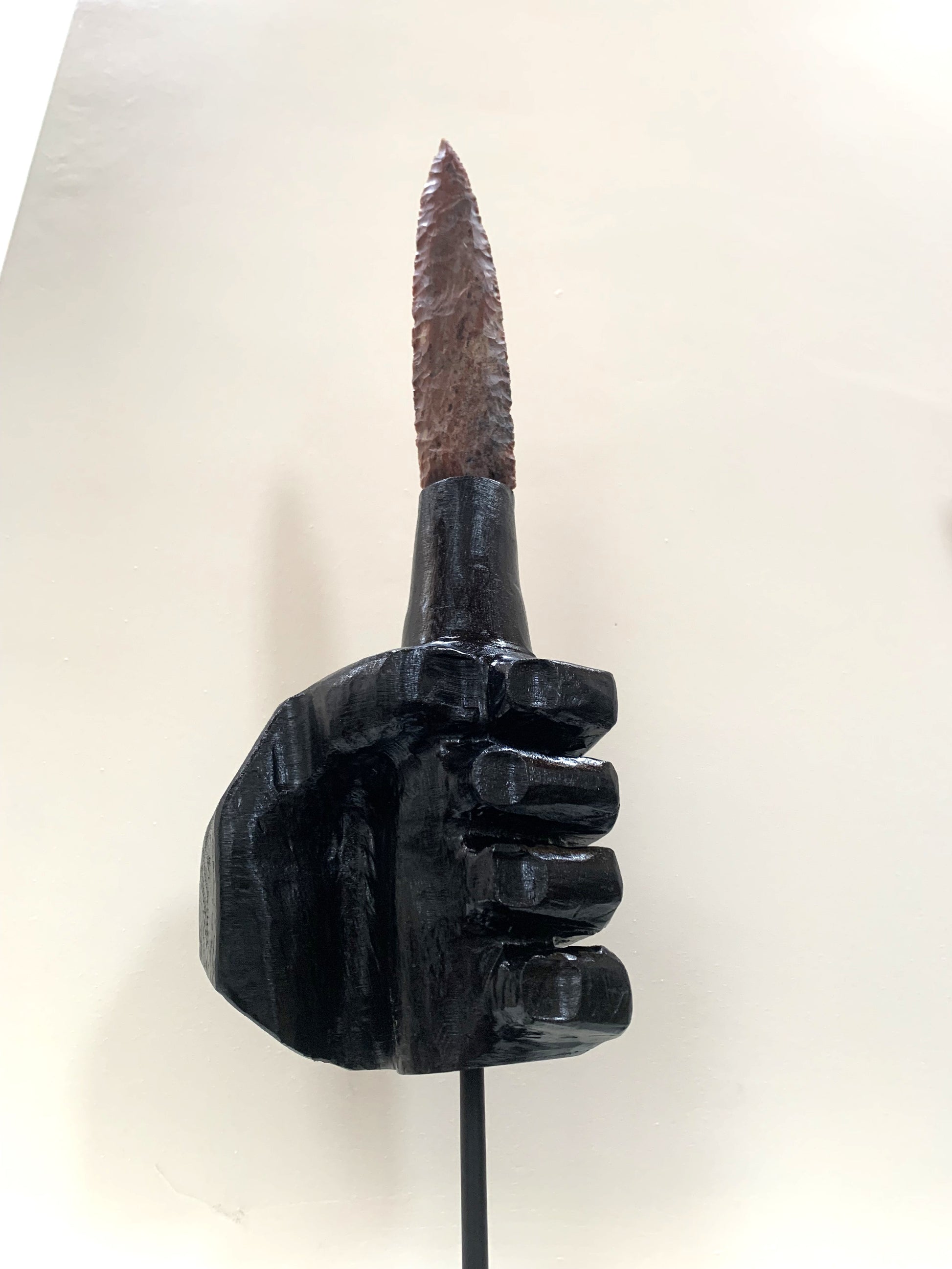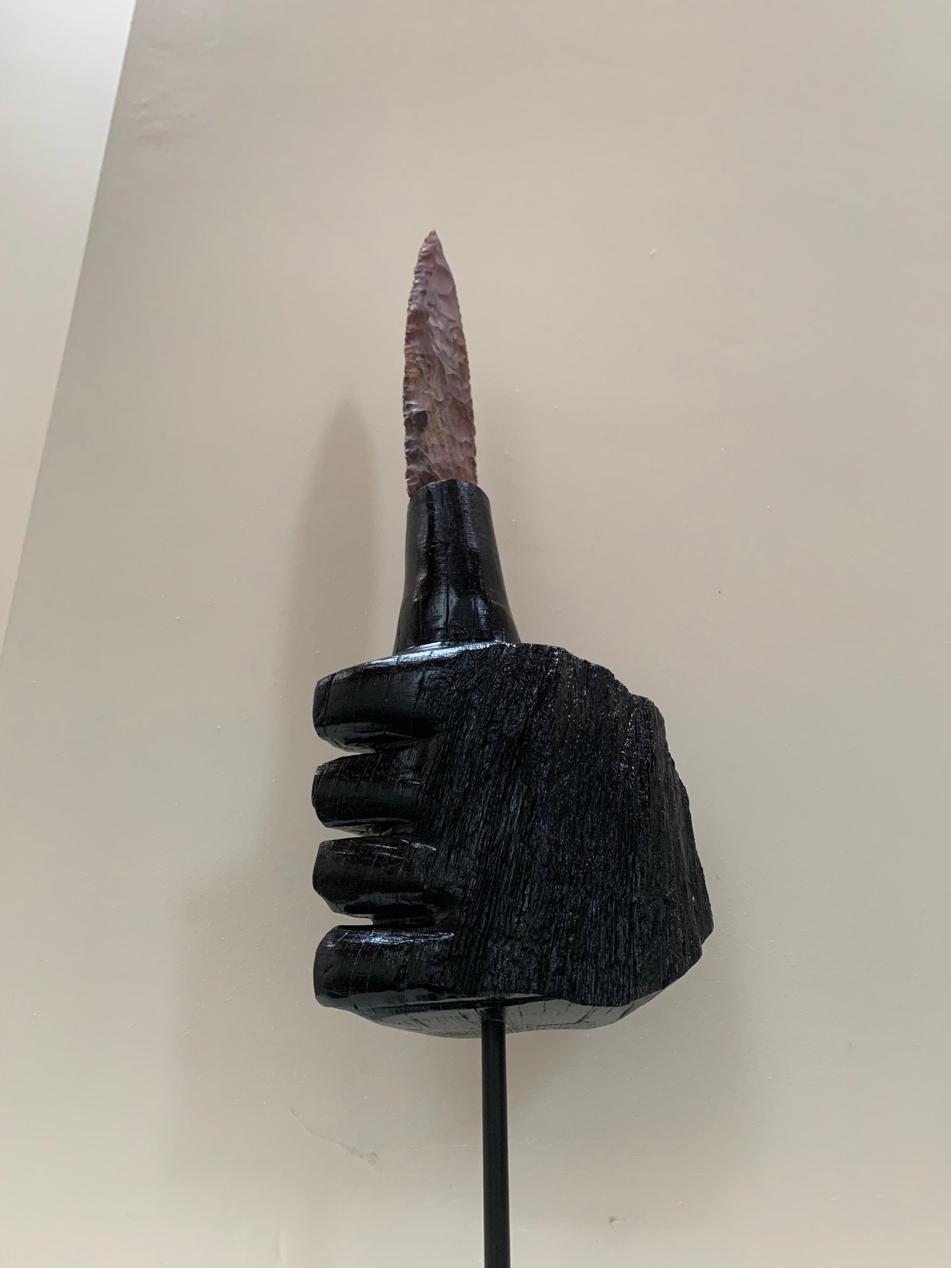 The original bog oak piece looked like a fist holding a spear in defiance so I sculpted the fingers, thumb and hand to emphasise the original feature. A replica stone-age flint spear head highlights the thousands and thousands of years since this piece of oak lived on earth before being entombed and preserved by the bog.