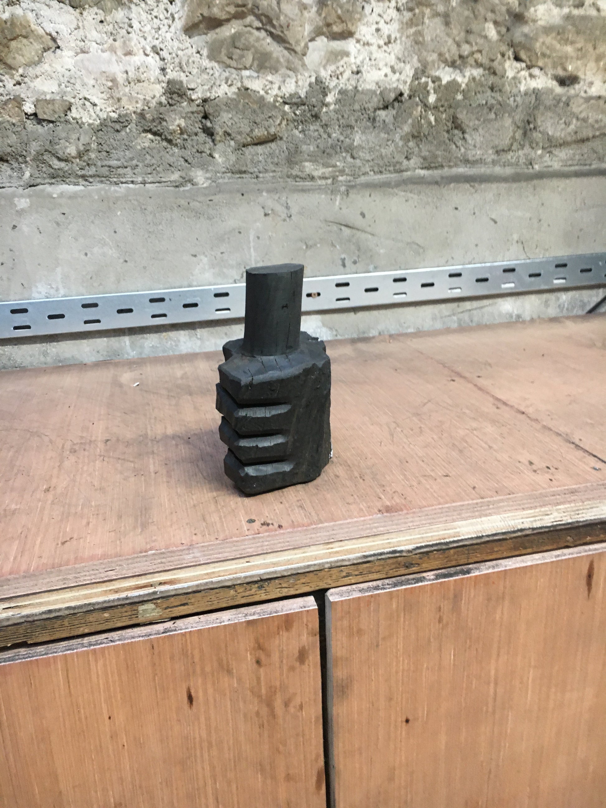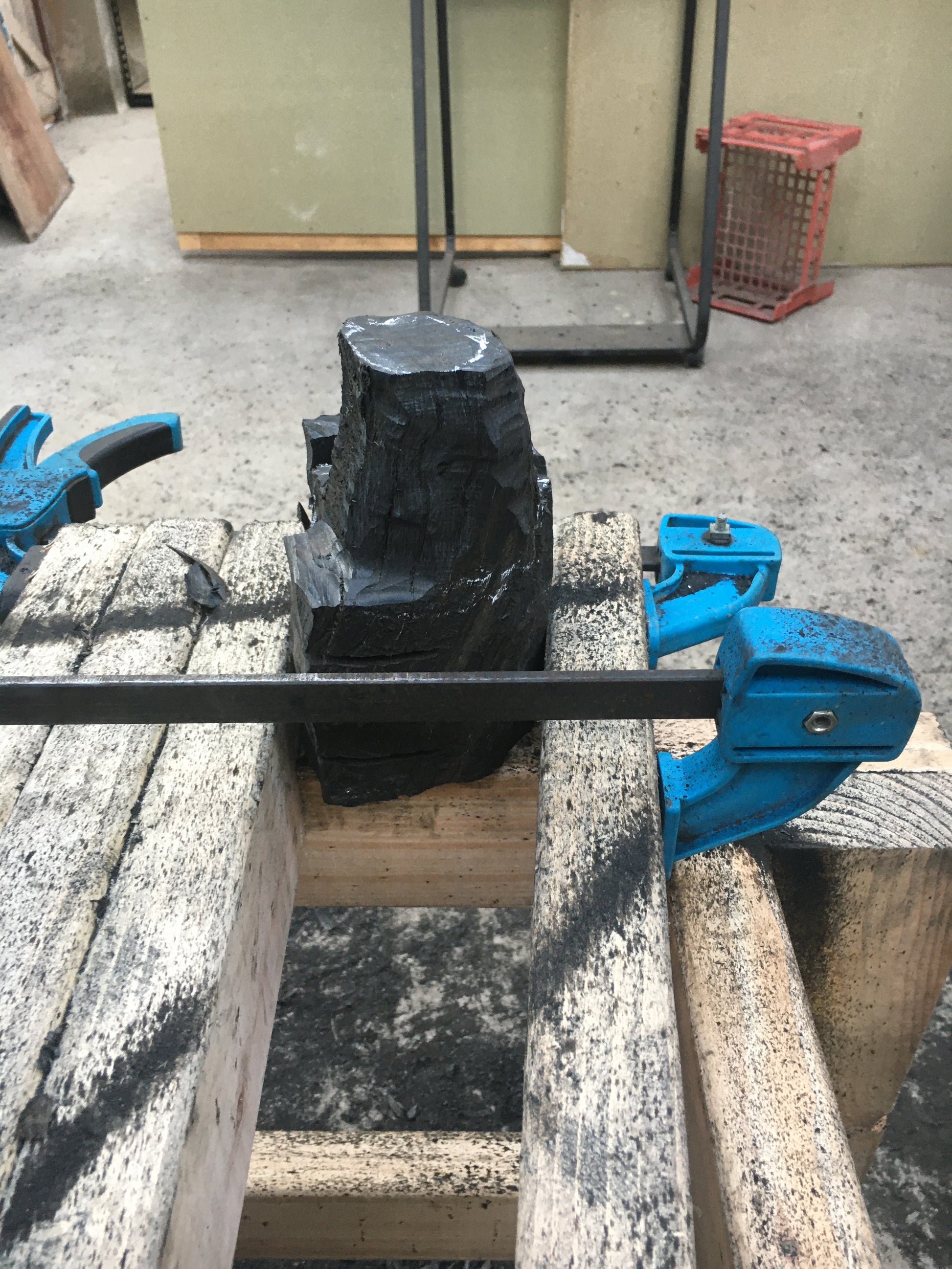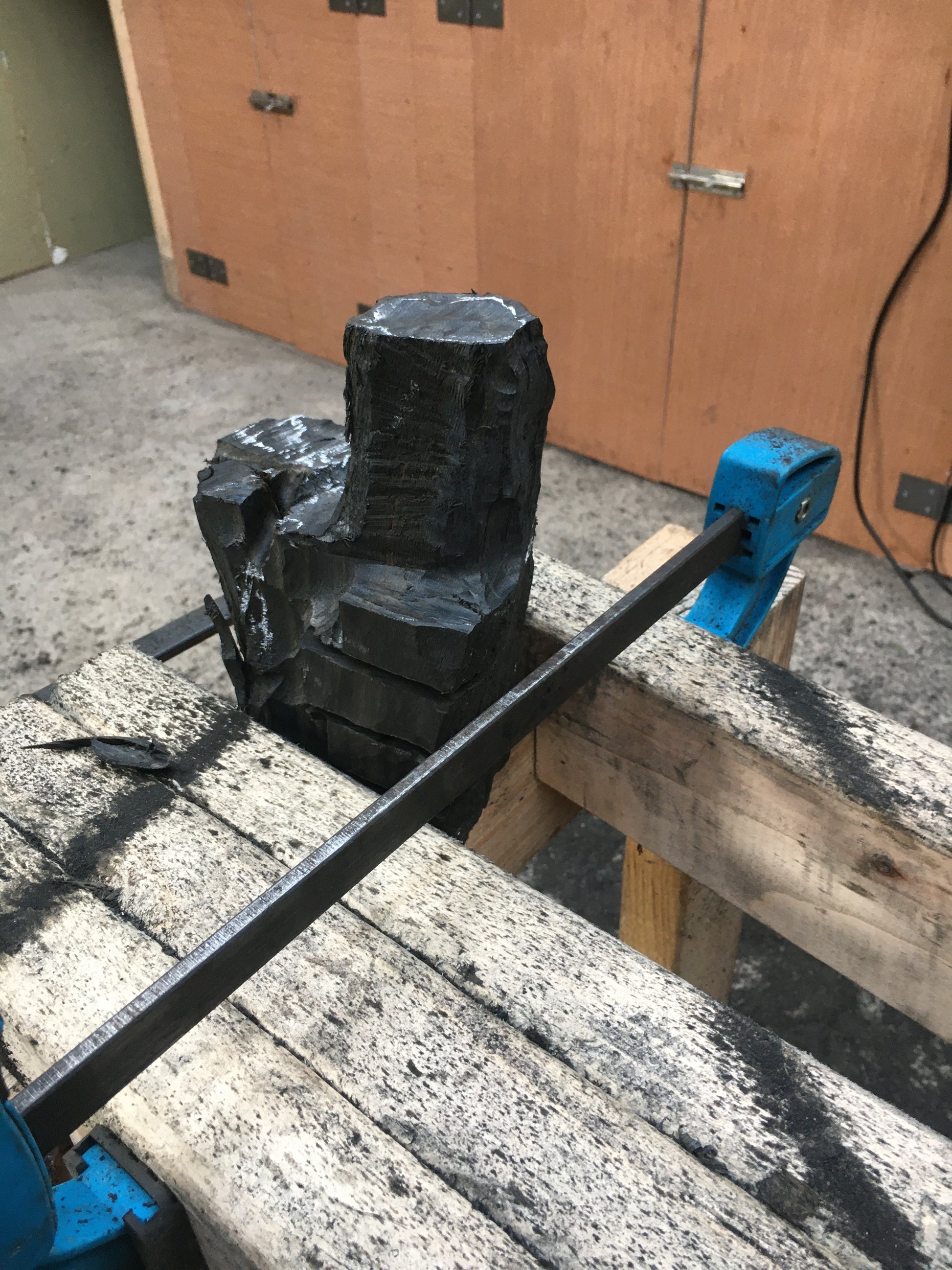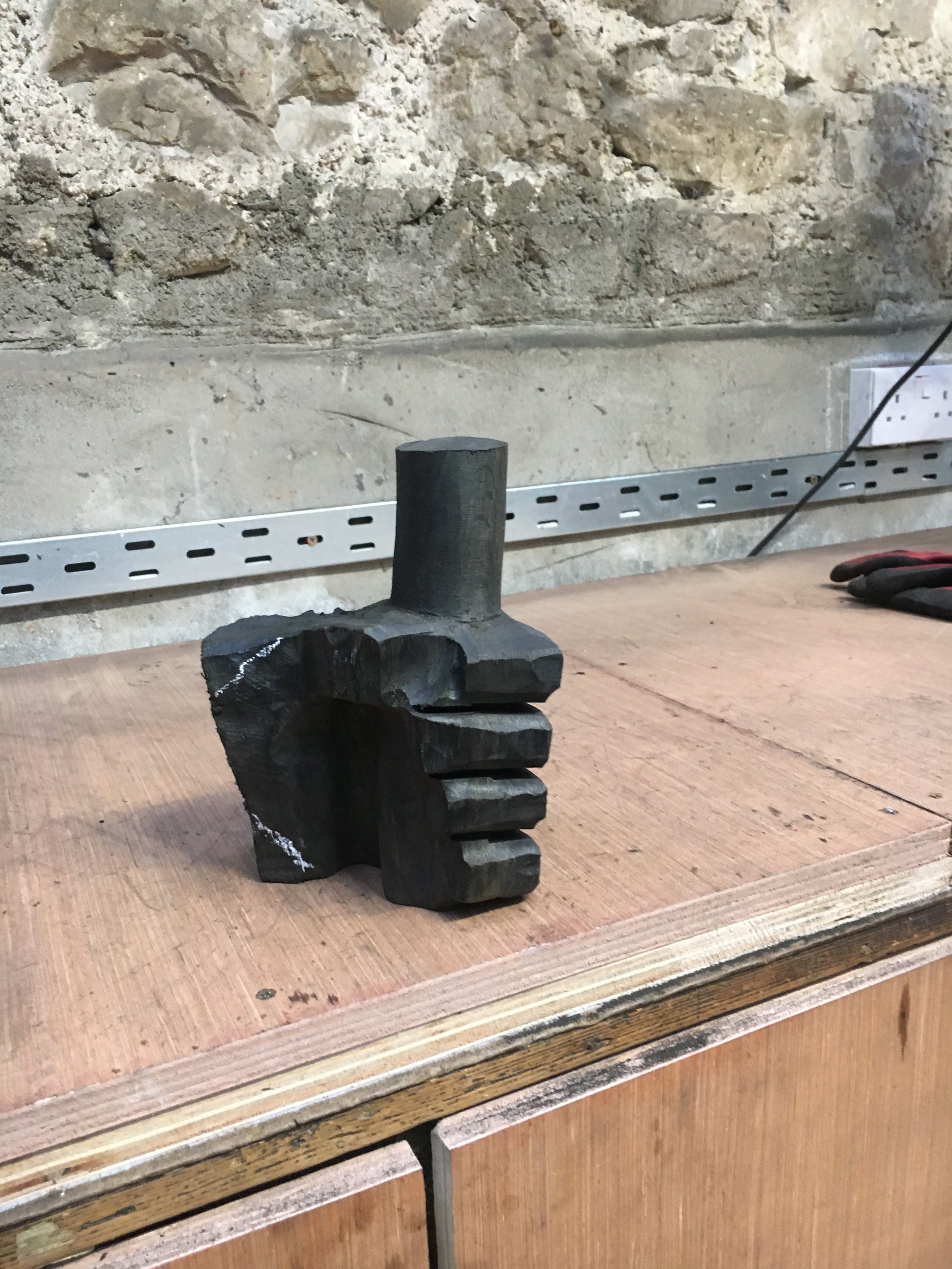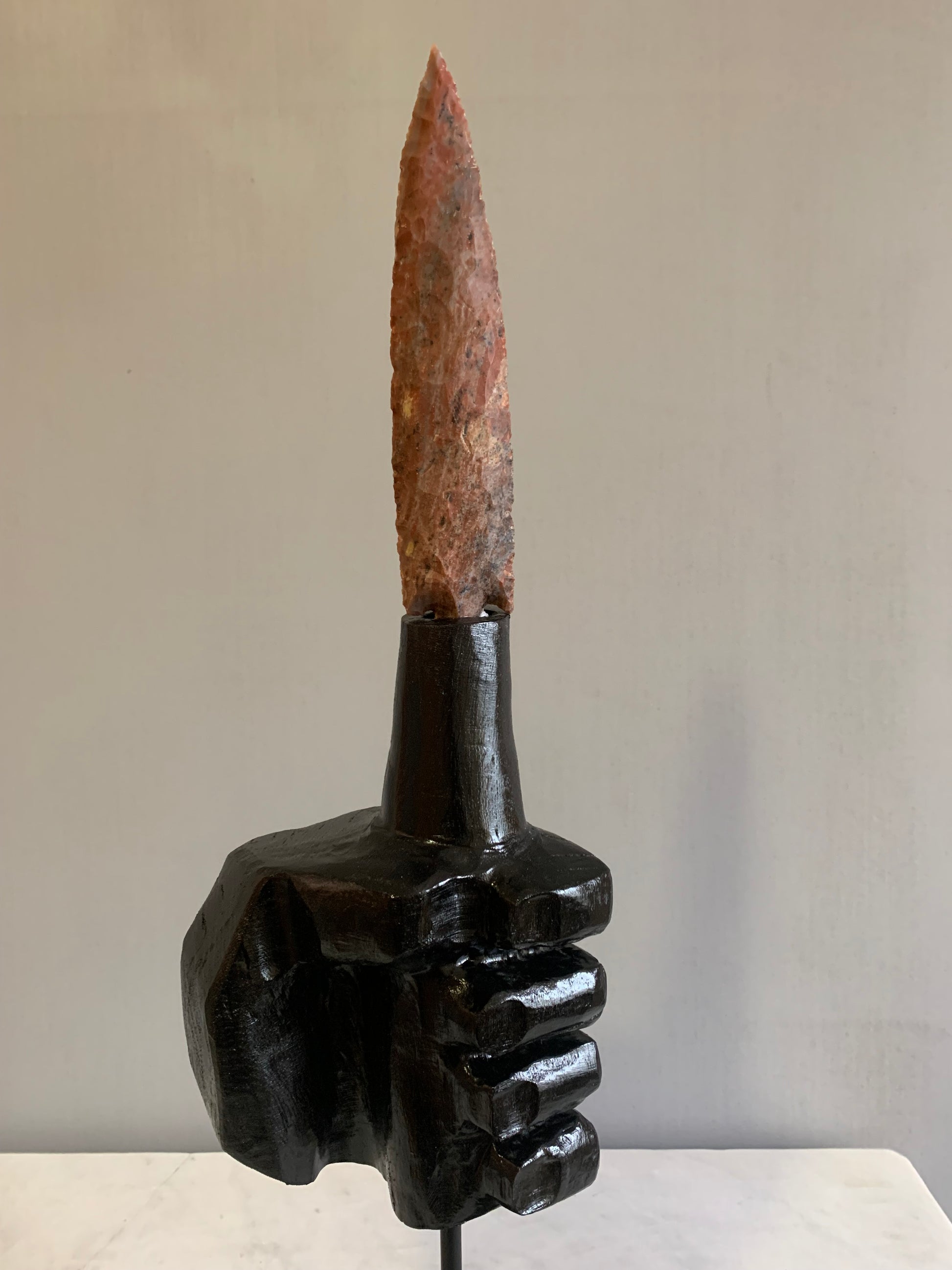 The original bog oak piece looked like a fist holding a spear in defiance so I sculpted the fingers, thumb and hand to emphasise the original feature. A replica stone-age flint spear head highlights the thousands and thousands of years since this piece of oak lived on earth before being entombed and preserved by the bog.