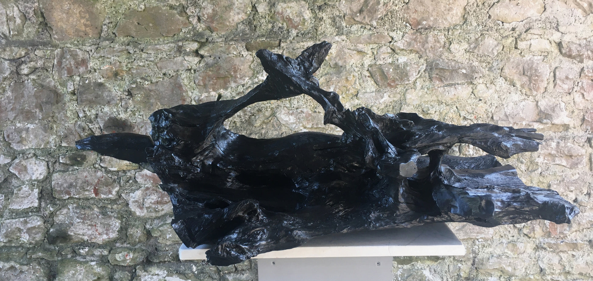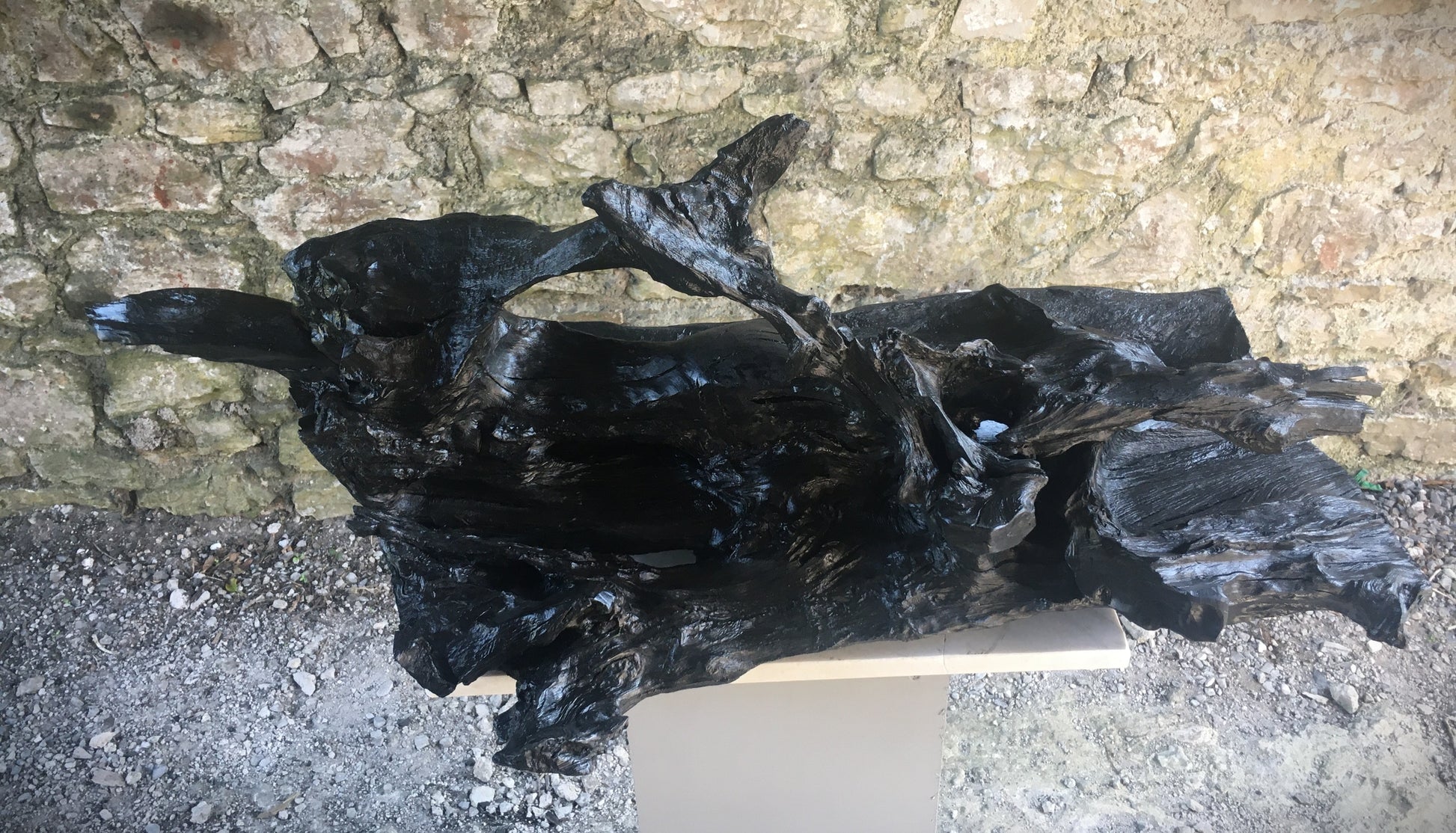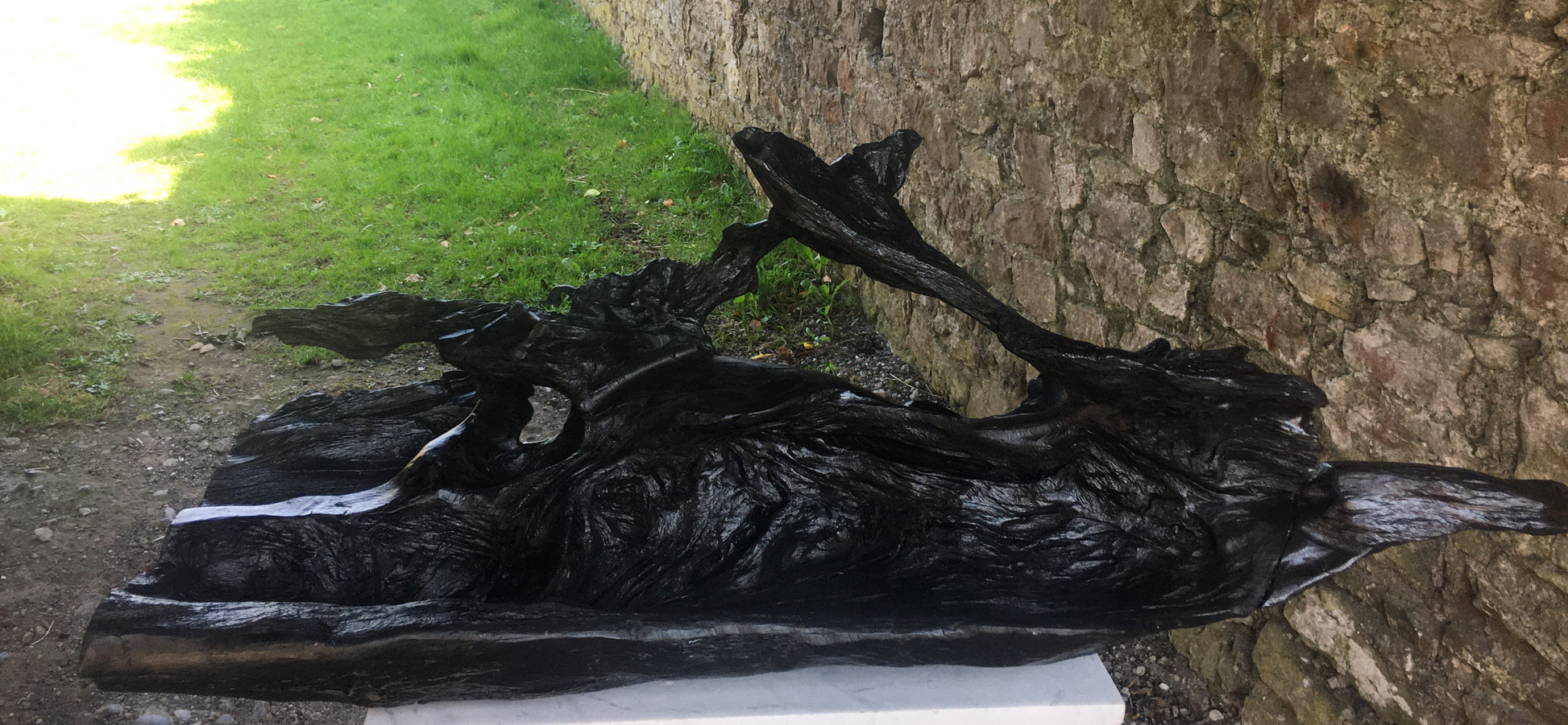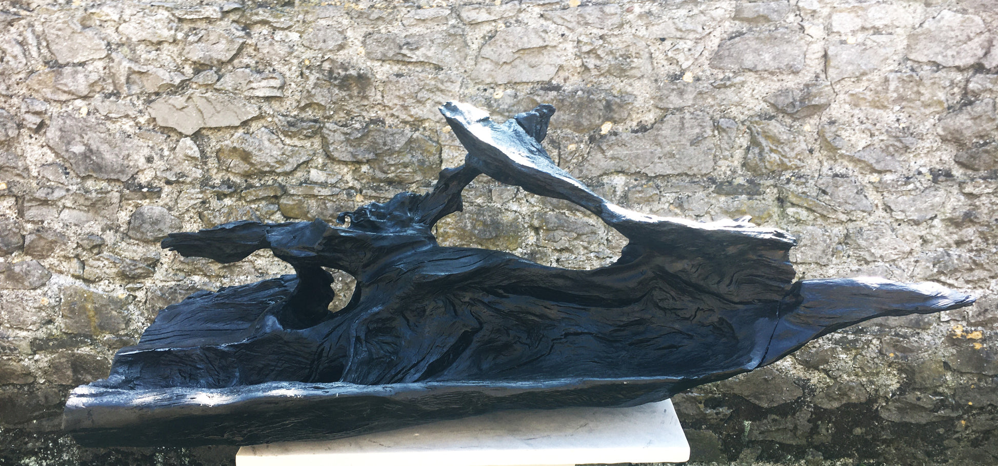 This was a large, heavy, twisted and gnarled piece of bog oak when we found it in the bog. The piece has amazing offshoots of hard and jagged oak going in every direction combined with incredible grains, twists and curves probably created by 100's of years compressed in the bog - while the underside is relatively flat and smooth. From first sight I could see the outline of a fox and when I started working on the piece I could see had just caught it's prey and had snared a bird in it's mouth. The fox lost it's tail in transit home from the bog but I managed to retrieve and re-attach it!