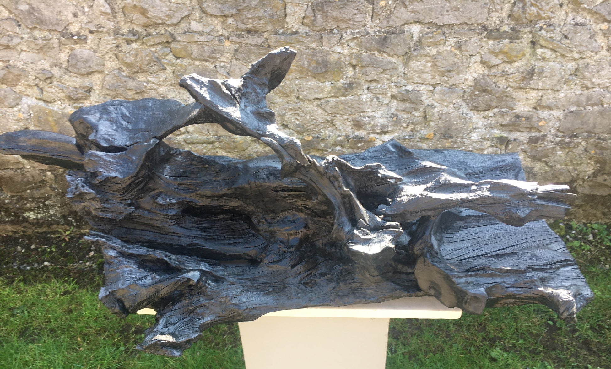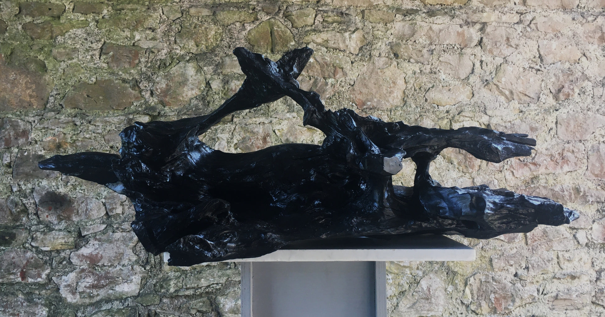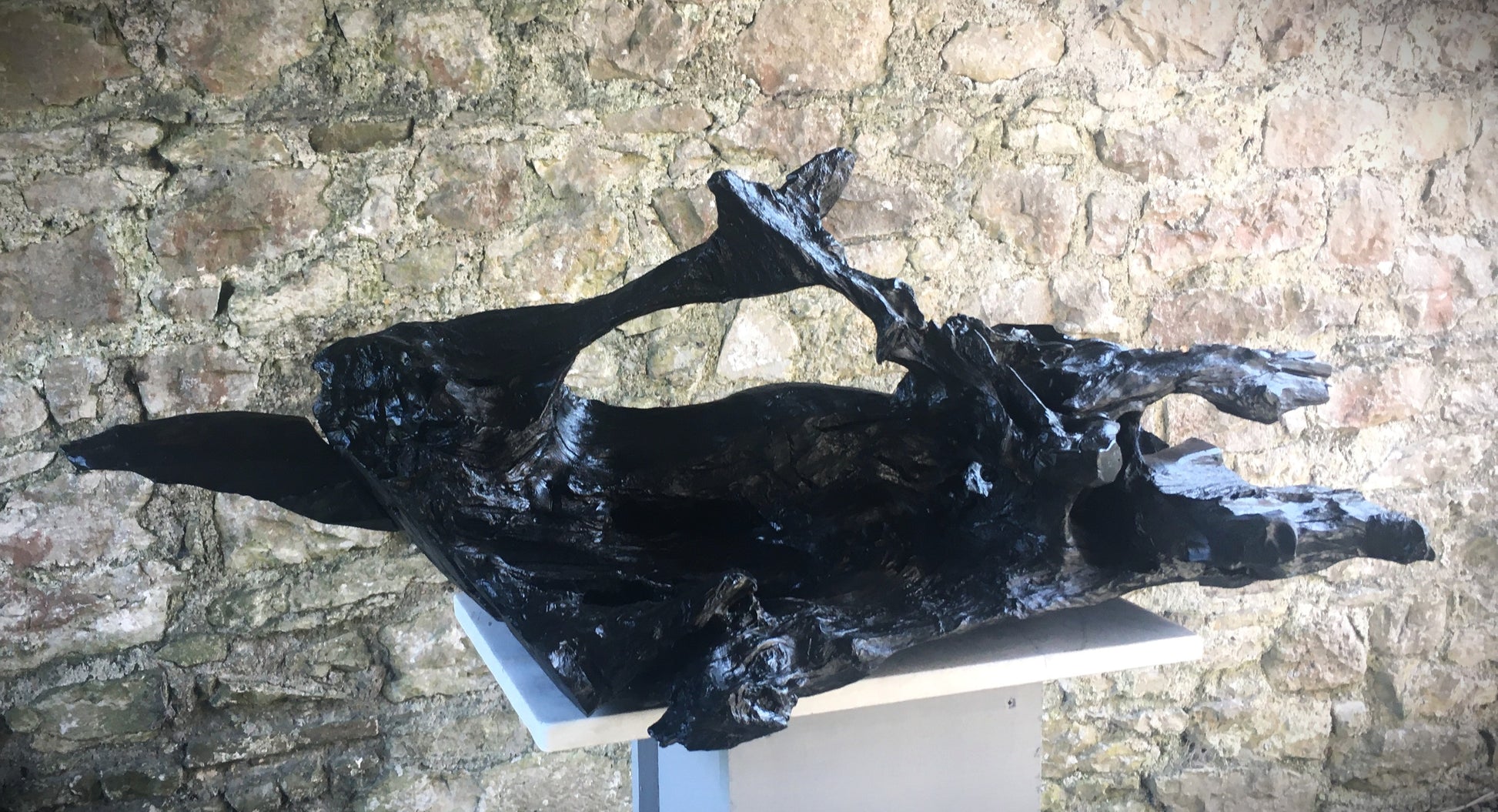 This was a large, heavy, twisted and gnarled piece of bog oak when we found it in the bog. The piece has amazing offshoots of hard and jagged oak going in every direction combined with incredible grains, twists and curves probably created by 100's of years compressed in the bog - while the underside is relatively flat and smooth. From first sight I could see the outline of a fox and when I started working on the piece I could see had just caught it's prey and had snared a bird in it's mouth. The fox lost it's tail in transit home from the bog but I managed to retrieve and re-attach it!