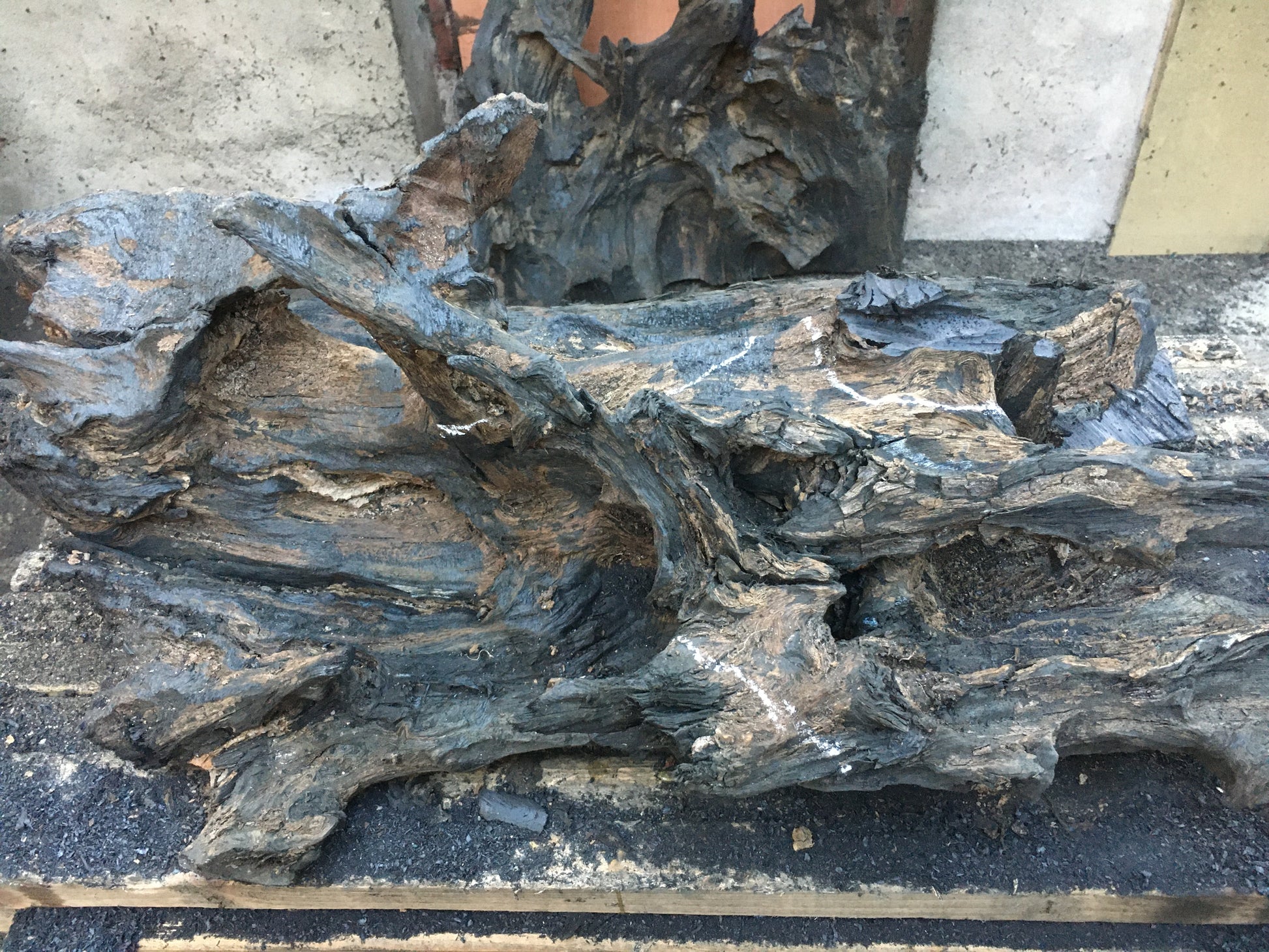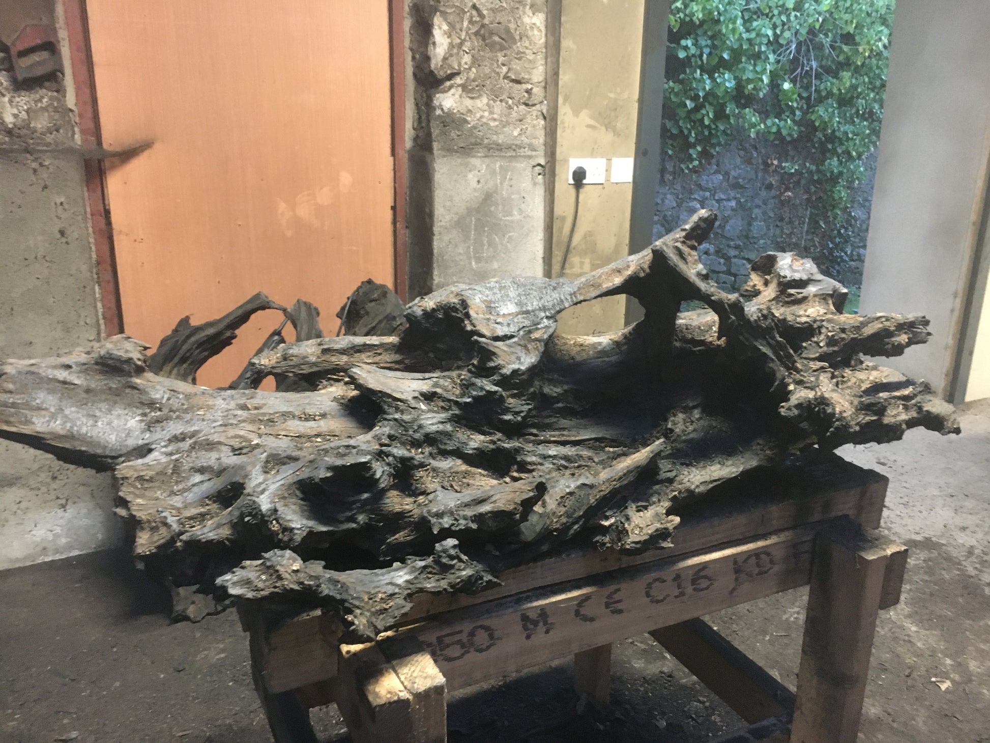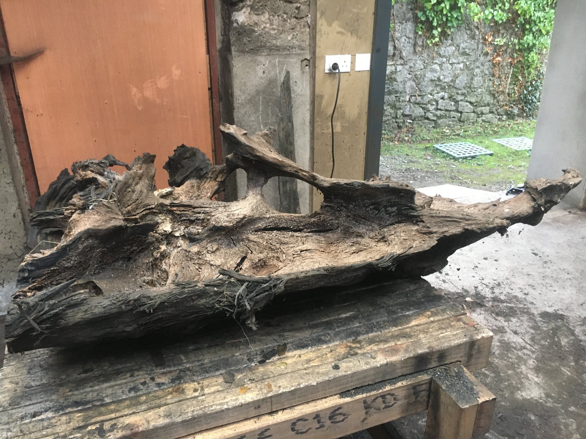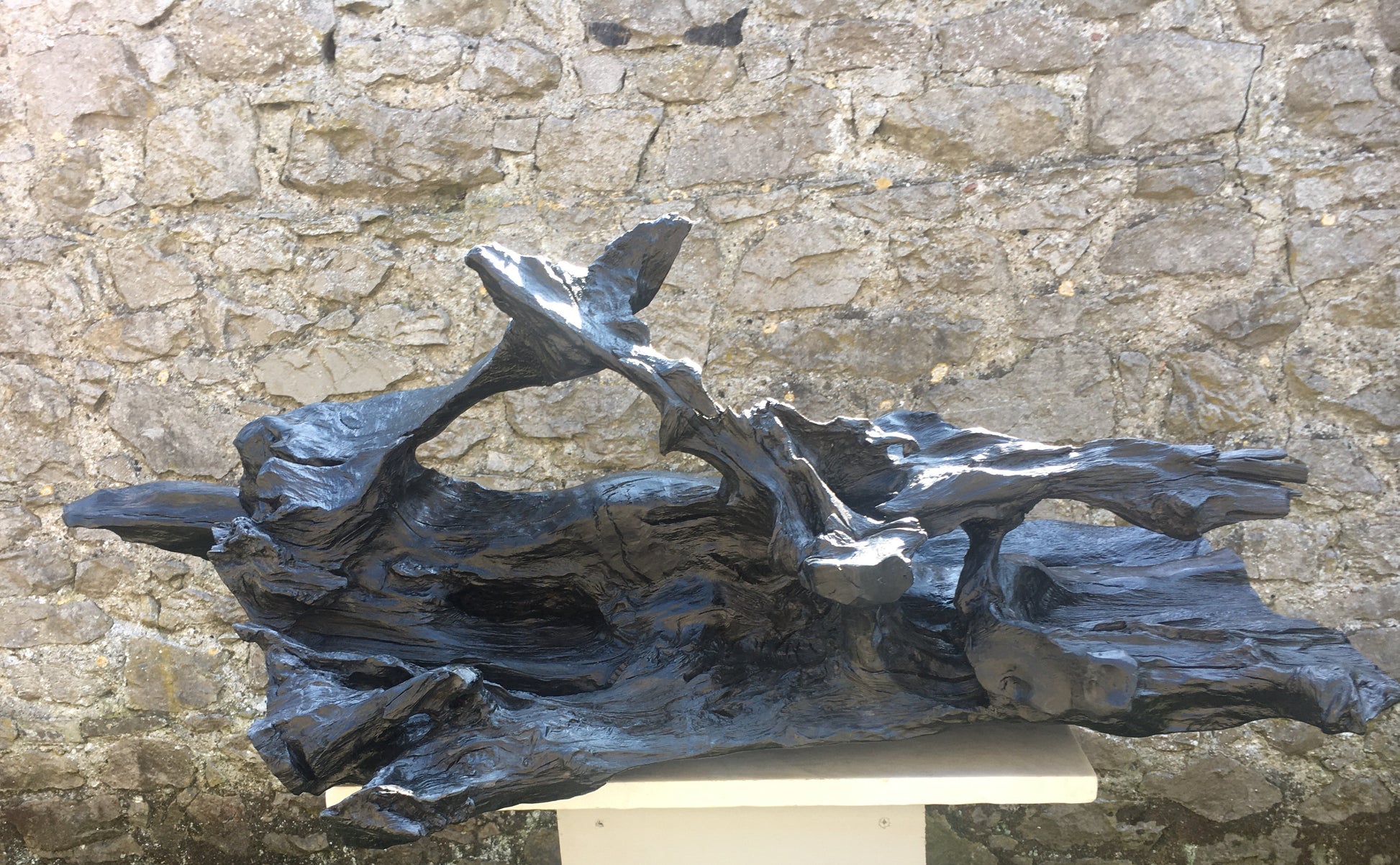 This was a large, heavy, twisted and gnarled piece of bog oak when we found it in the bog. The piece has amazing offshoots of hard and jagged oak going in every direction combined with incredible grains, twists and curves probably created by 100's of years compressed in the bog - while the underside is relatively flat and smooth. From first sight I could see the outline of a fox and when I started working on the piece I could see had just caught it's prey and had snared a bird in it's mouth. The fox lost it's tail in transit home from the bog but I managed to retrieve and re-attach it!