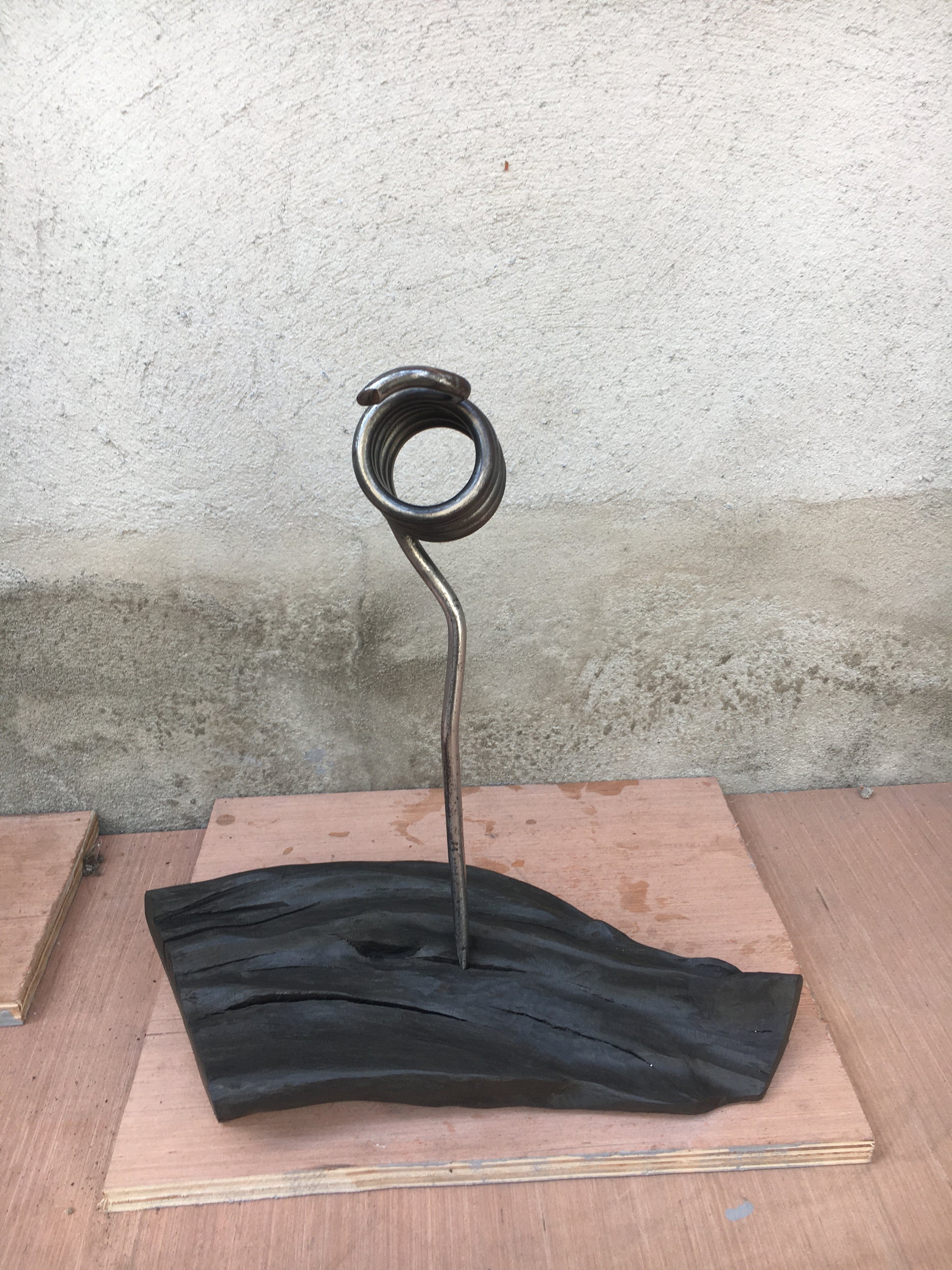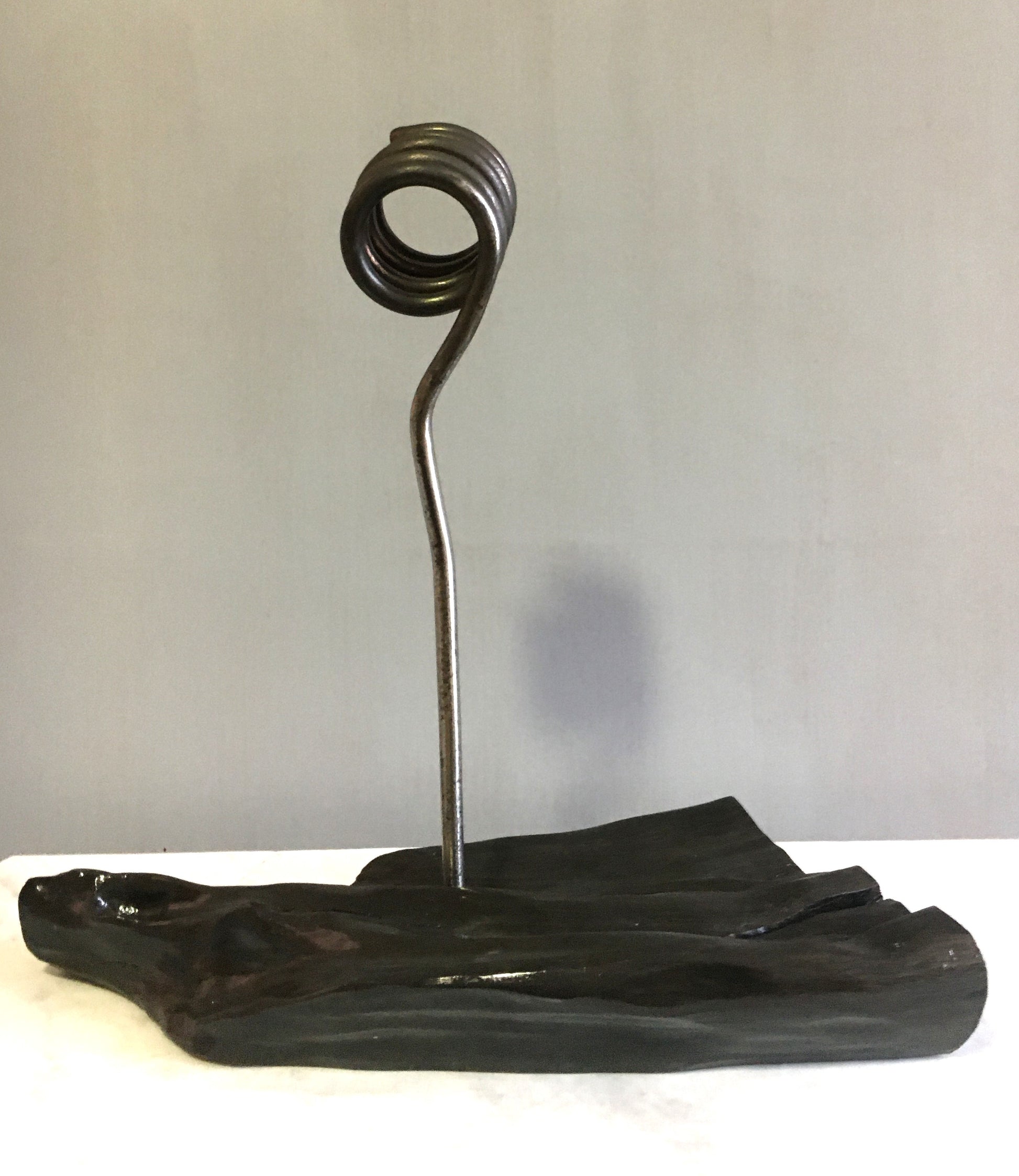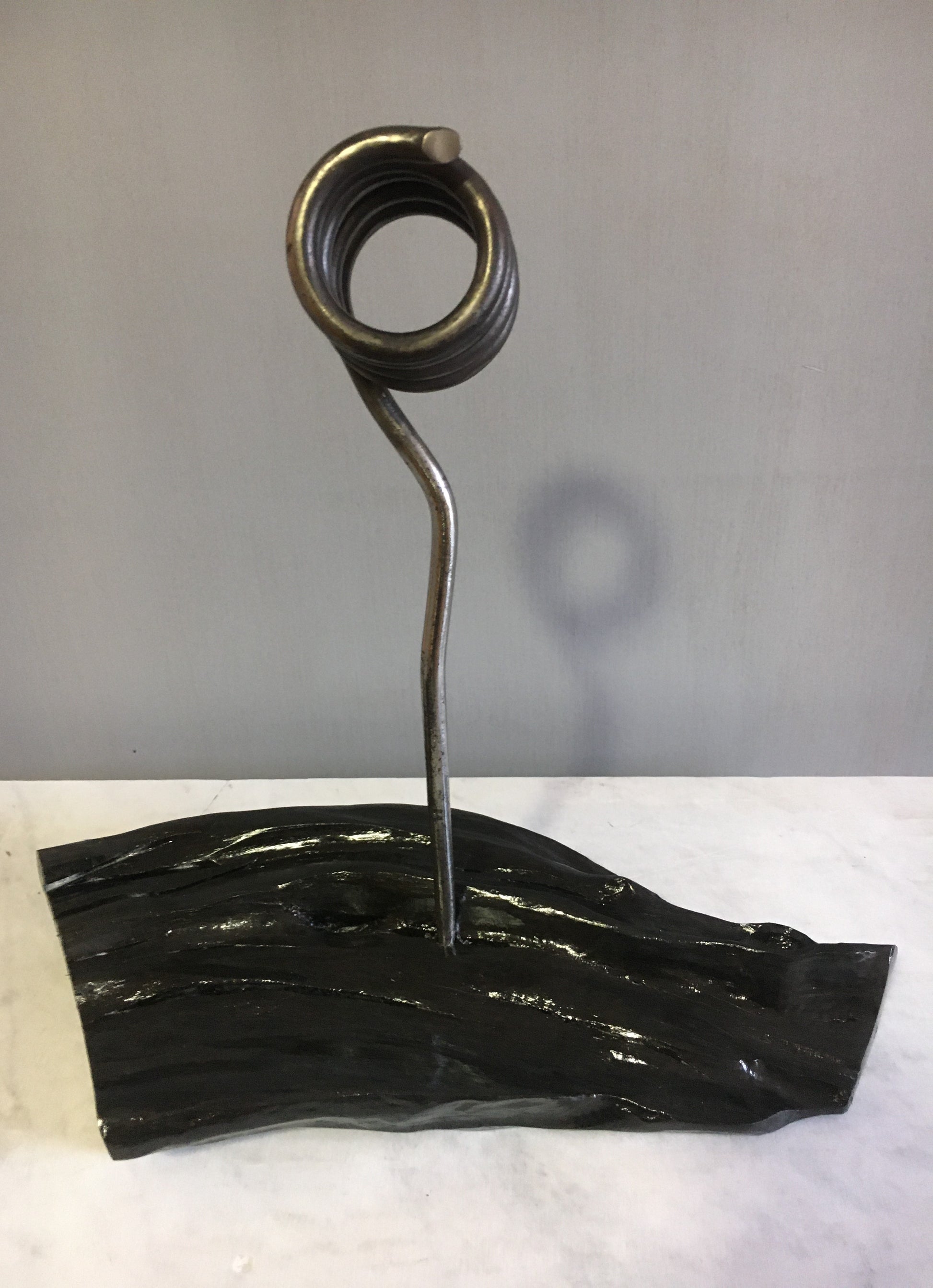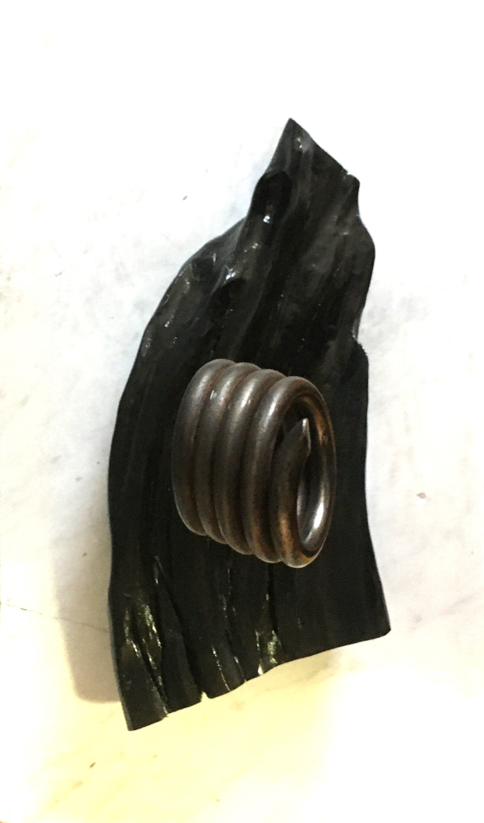In the old stone out-buildings beside my workshop there are shelves of old broken retired tools and agricultural implements. Discarding and waste was frowned upon by older generations. Reuse and sustainability was commendably the norm long before the current environmental necessity. "Don't throw that out - you never know what that could be used for yet" was the anthem! I came across this half broken hay bob tine that hasn't turned hay for many decades of summers. I had this this wonderful bog oak offcut on the workbench with its unique curves and cracks and I married it with the hay bob tine with its man made coil spring curves and neck. A strange but yet a compatible connection between the millennia.