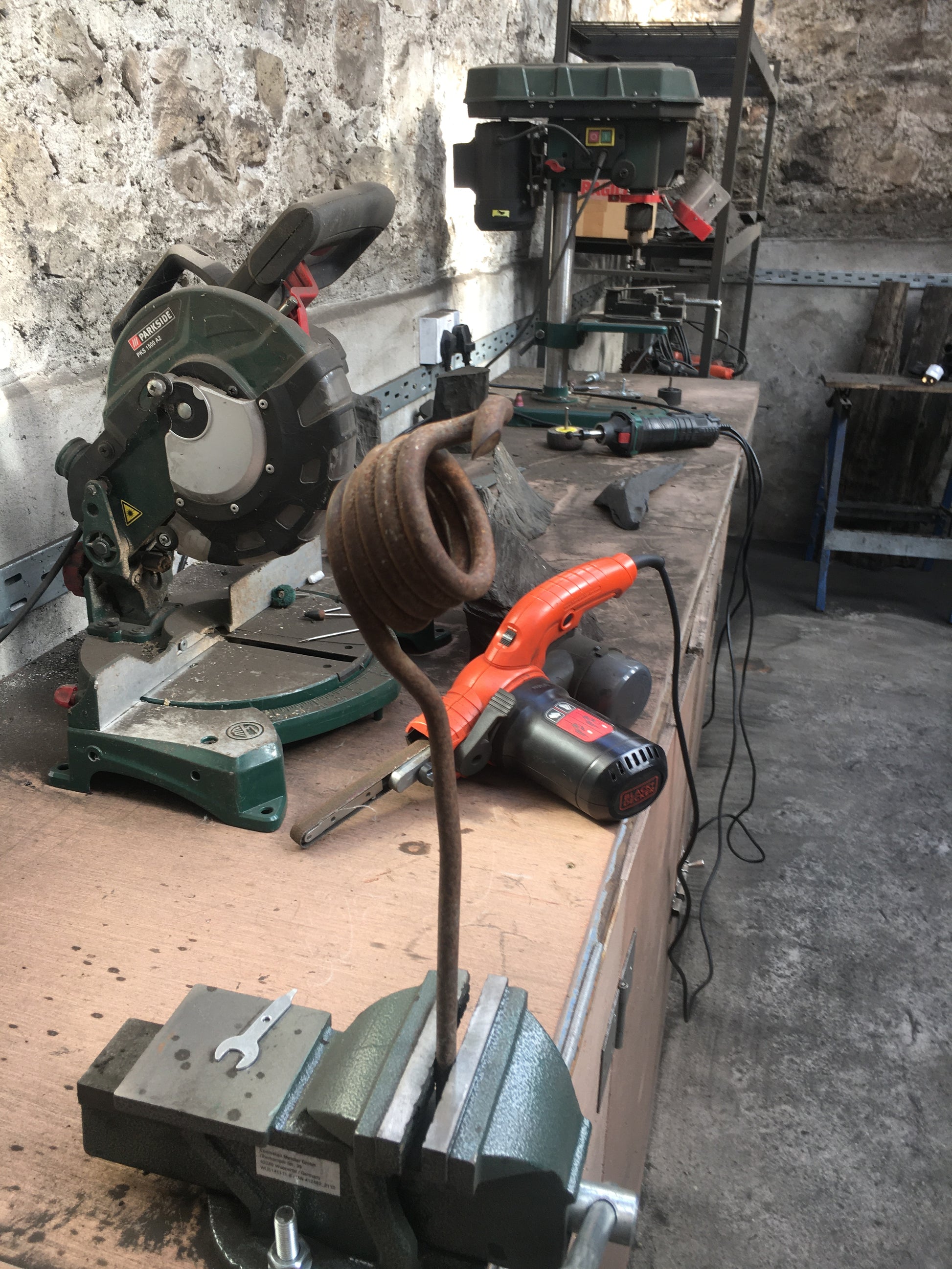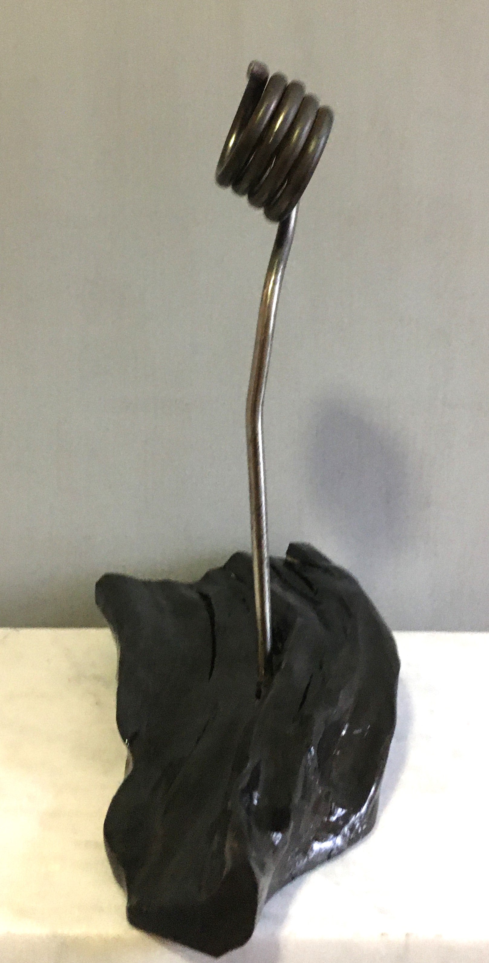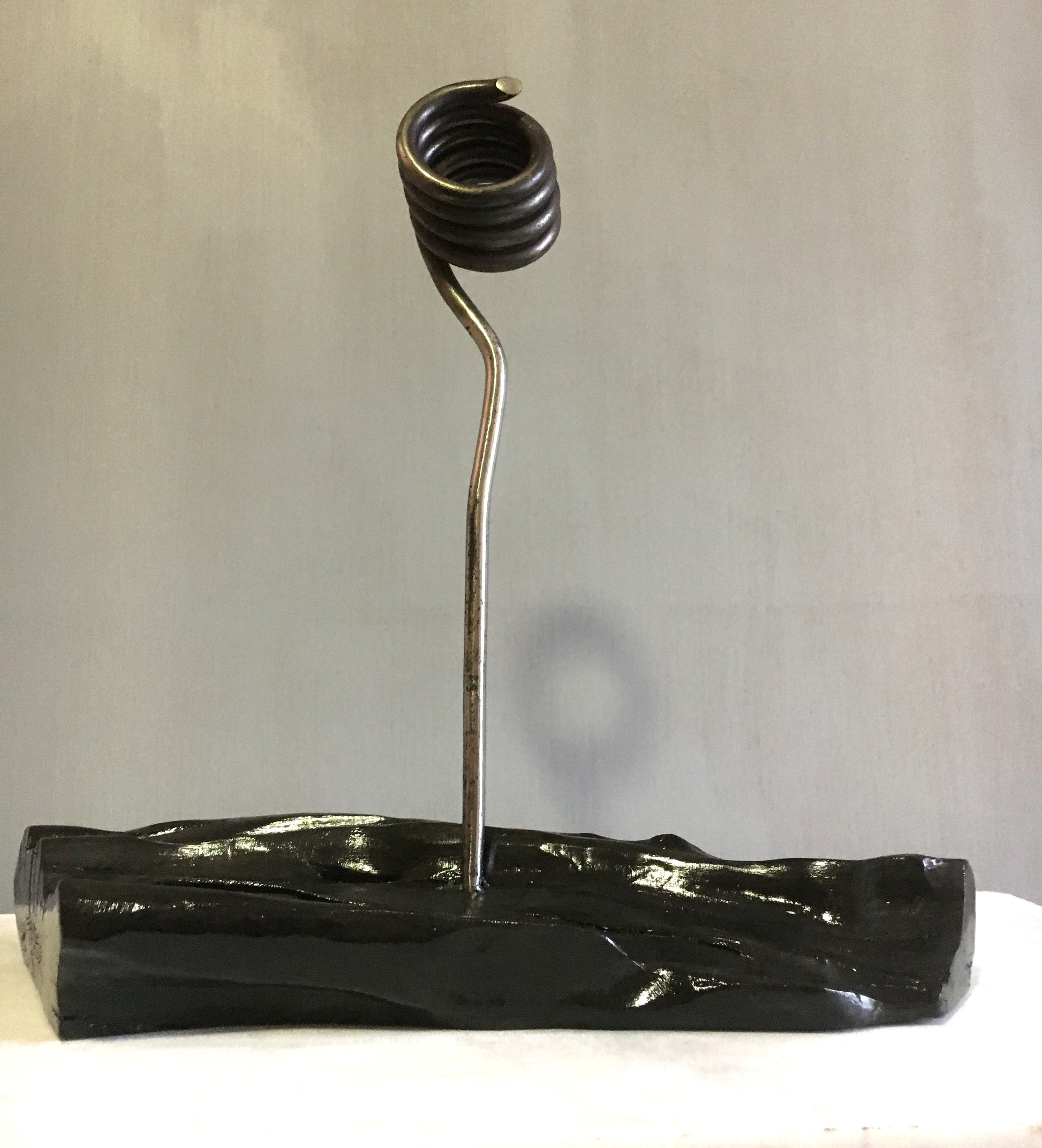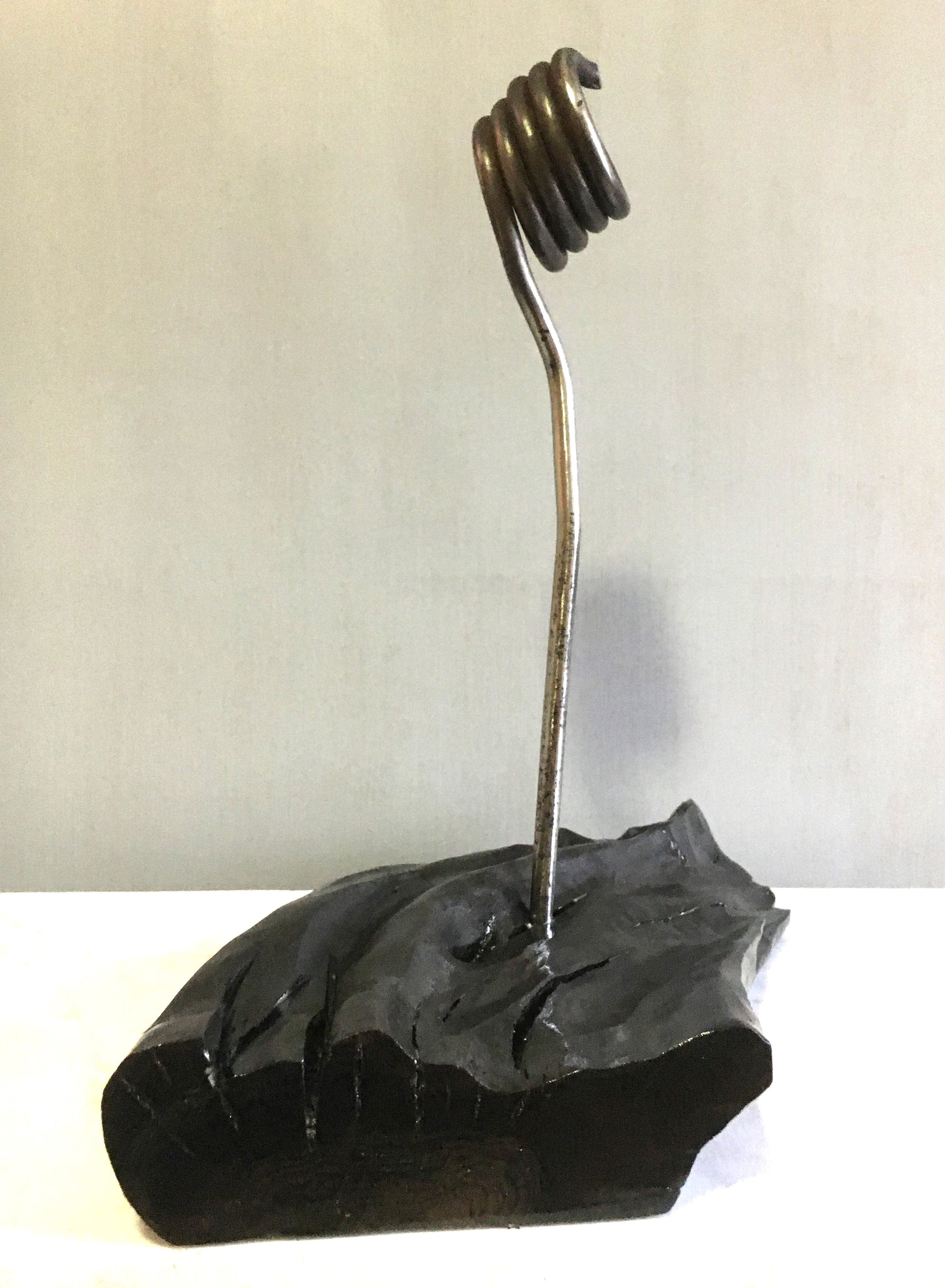 In the old stone out-buildings beside my workshop there are shelves of old broken retired tools and agricultural implements. Discarding and waste was frowned upon by older generations. Reuse and sustainability was commendably the norm long before the current environmental necessity. "Don't throw that out - you never know what that could be used for yet" was the anthem! I came across this half broken hay bob tine that hasn't turned hay for many decades of summers. I had this this wonderful bog oak offcut on the workbench with its unique curves and cracks and I married it with the hay bob tine with its man made coil spring curves and neck. A strange but yet a compatible connection between the millennia.