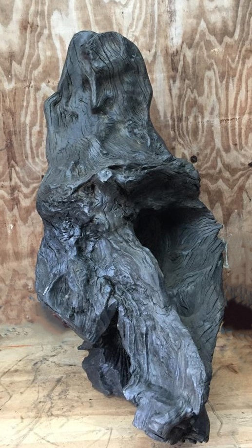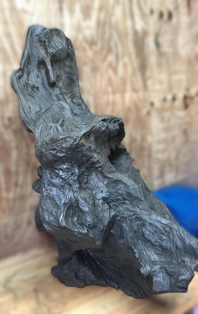 When I cleaned this piece down for the first time I could see an ancient Bard sitting with his arms and legs crossed on a tree stump beside a camp fire at night in a dark forest telling spine-tingling stories of the underworld and mythical legends. I sculpted his head from the surrounding wood but the rest remained as it came from the bog. The bog oak wood is so hard that the wood grain and contours are almost rock like.
