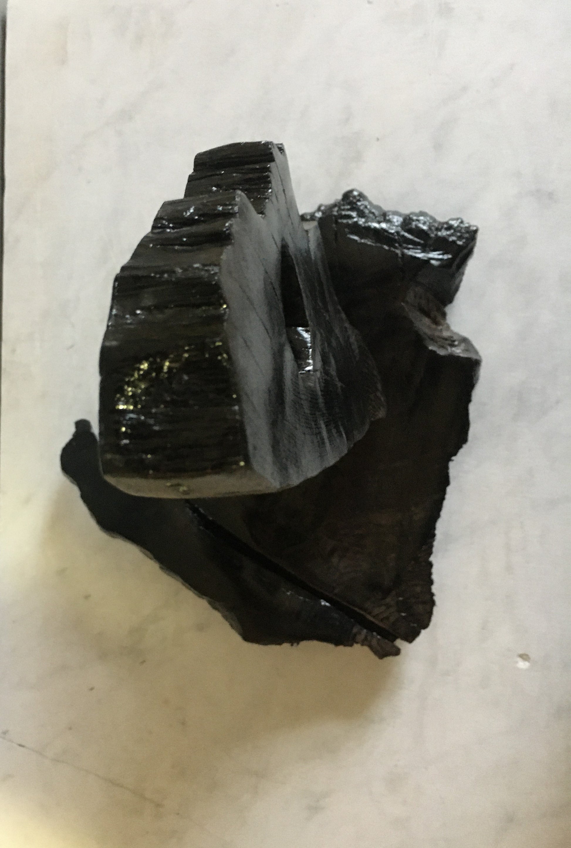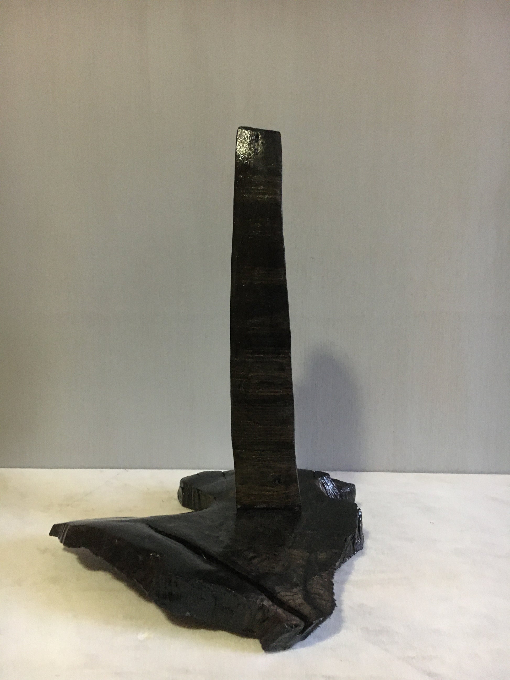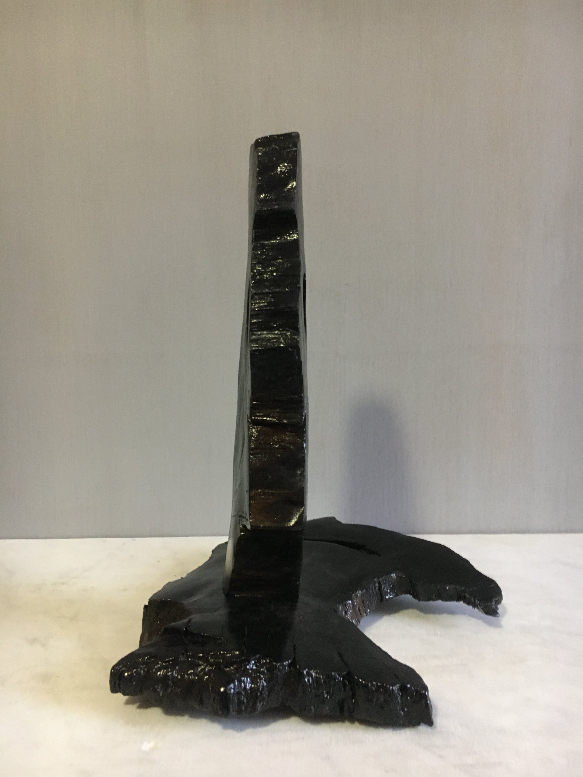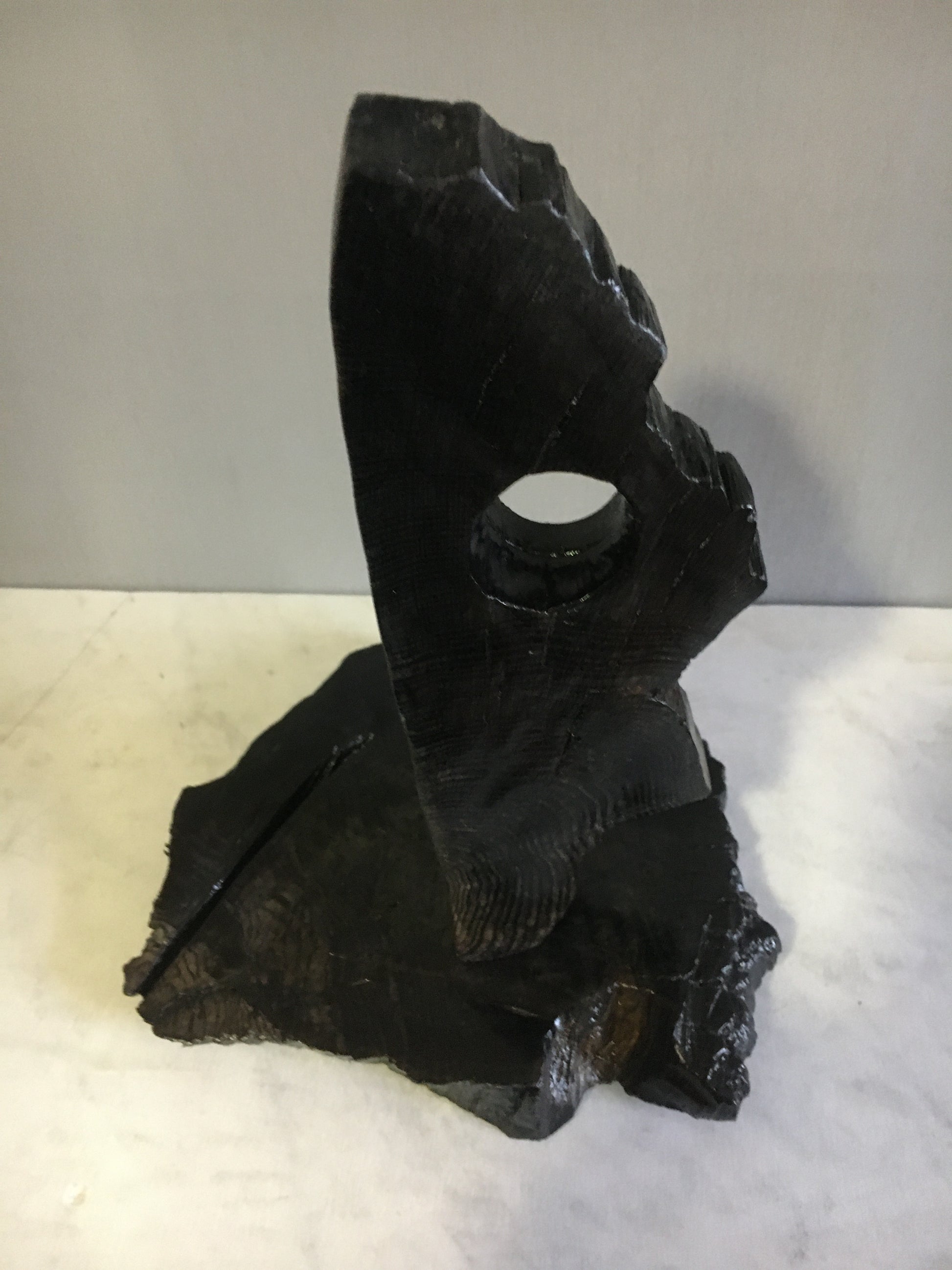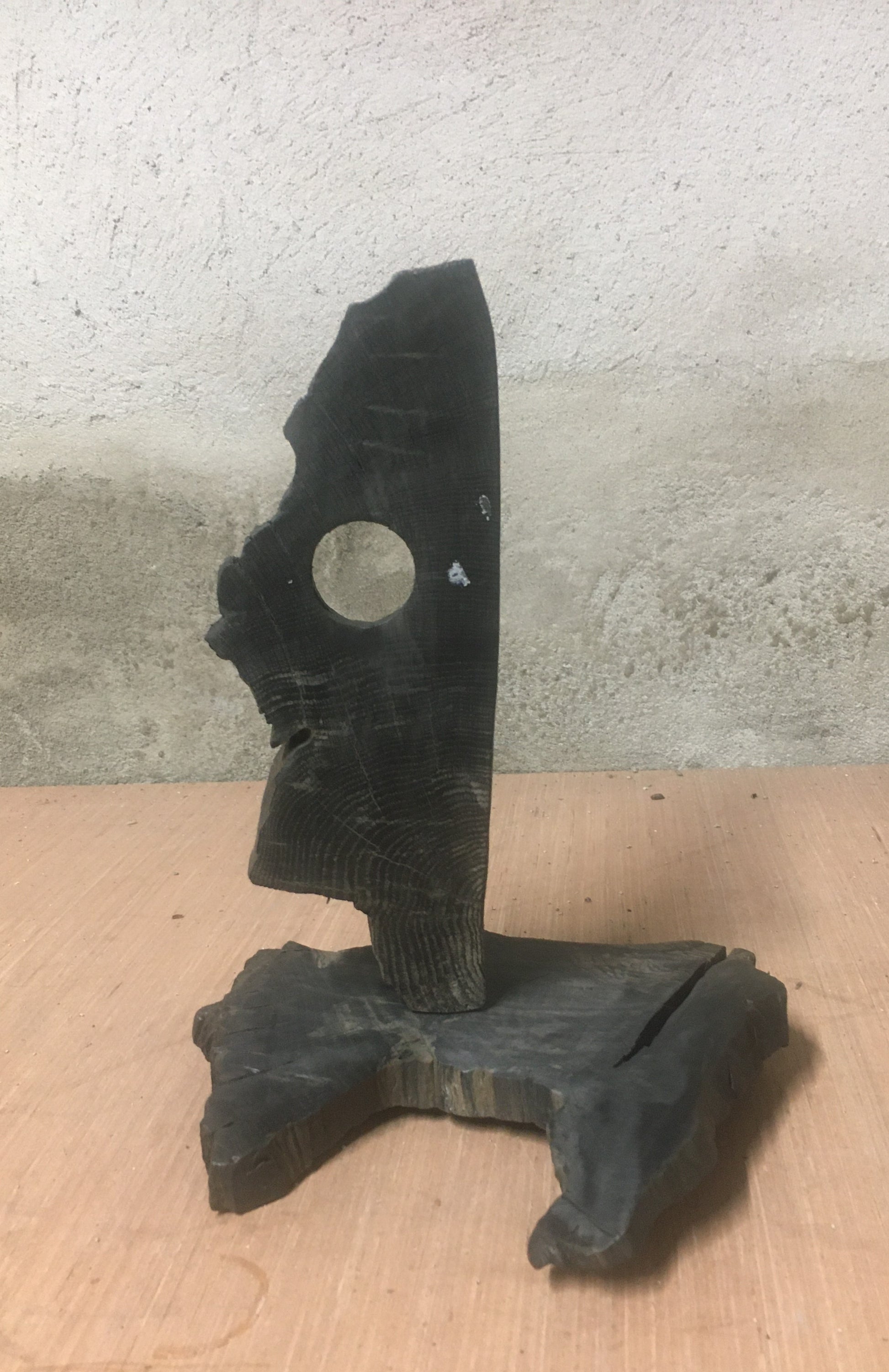 I needed a circular piece of bog oak to use as a plug on another sculpture to conceal a bolted connection so I holed sawed a circle from this flat offcut that was in the workshop and the result was this head profile with eyes that you can look through. We are all familiar with the expression "to look through someone!". I found another unique offcut to create a base to mount the head on and have left the original course grain of the bog oak on the edge profiles of both sections.