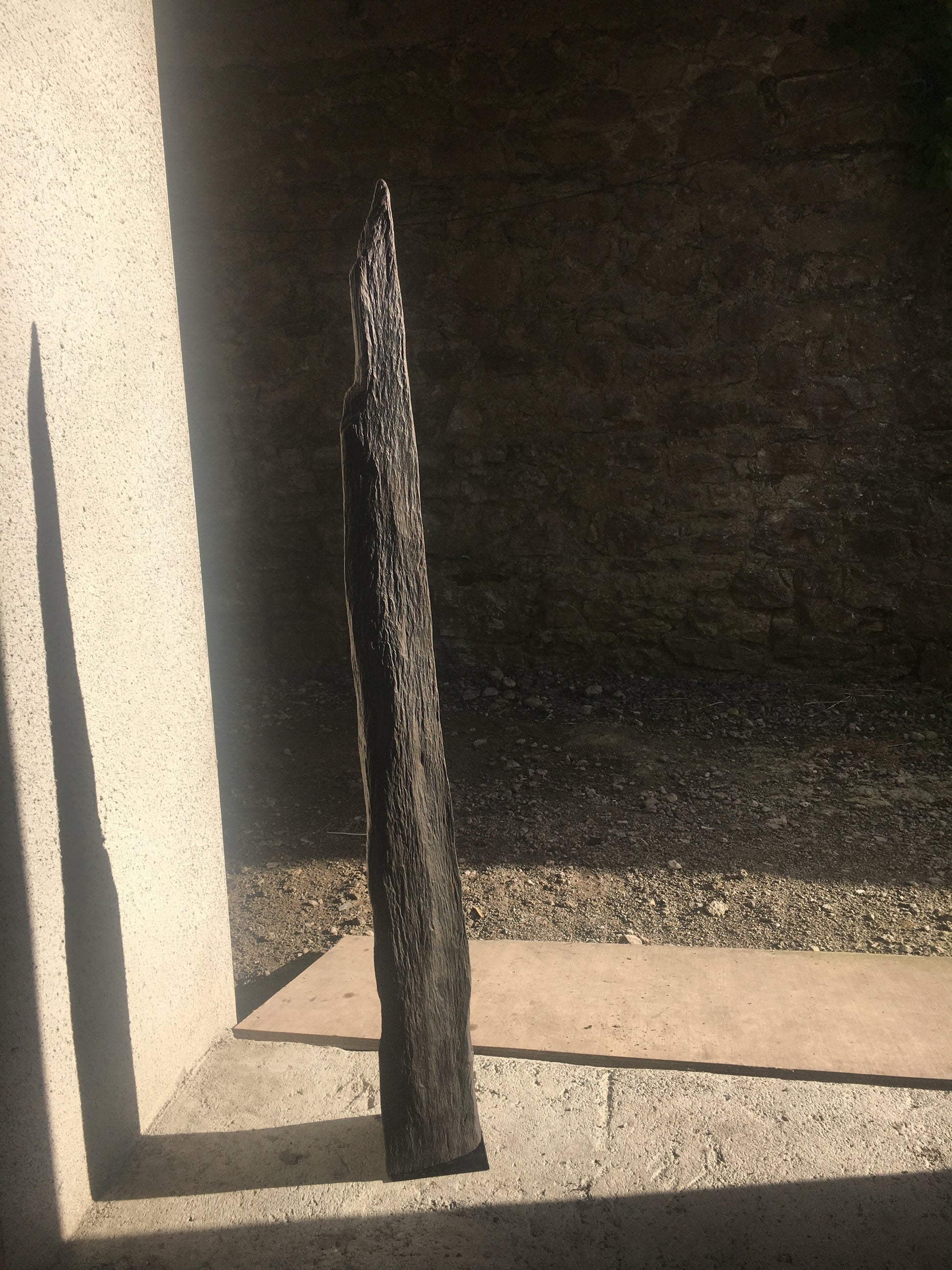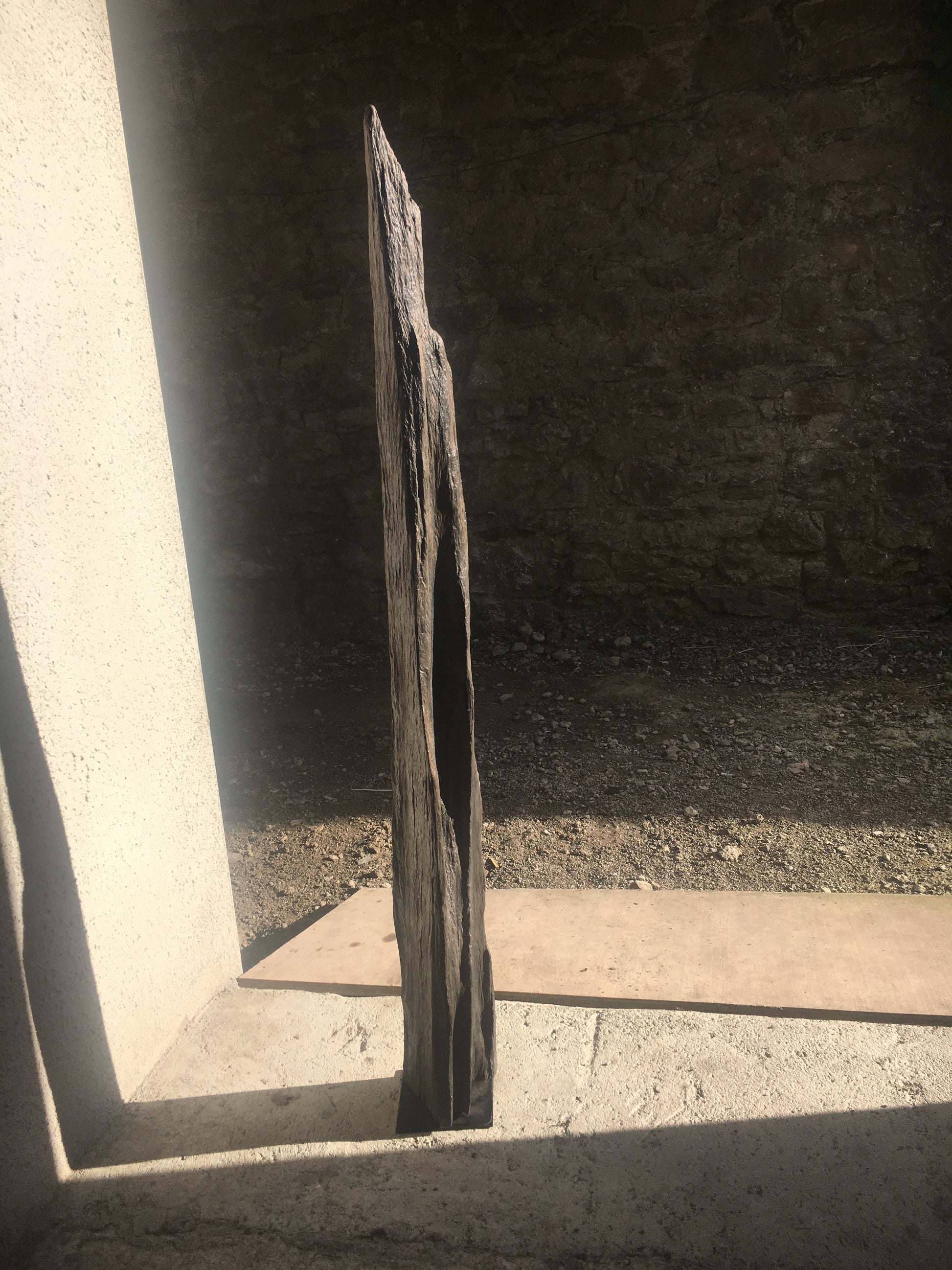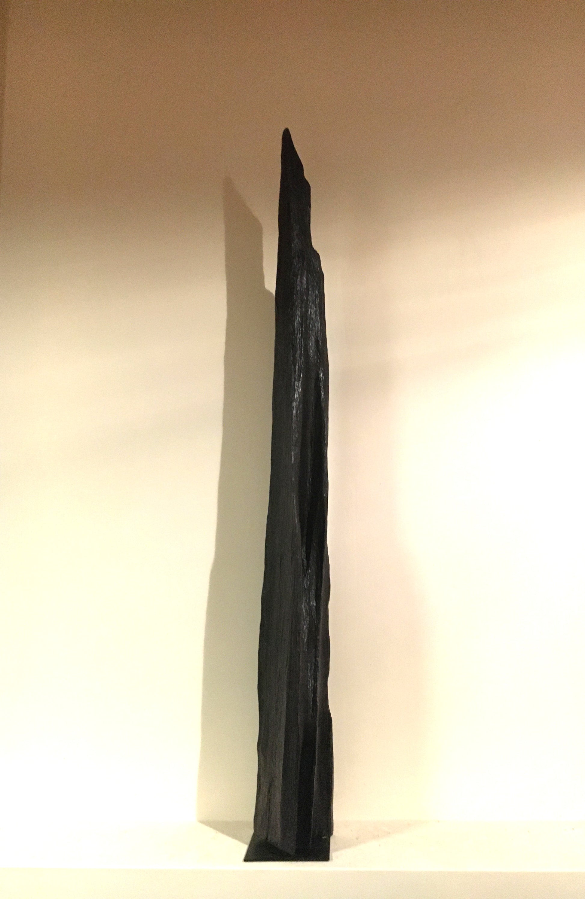 This straight, slender and proud standing piece of bog oak is exactly the shape that emerged from the bog - I removed the covering of peat and earth and left the existing even surface of the wood rough and as close to the original texture as possible,