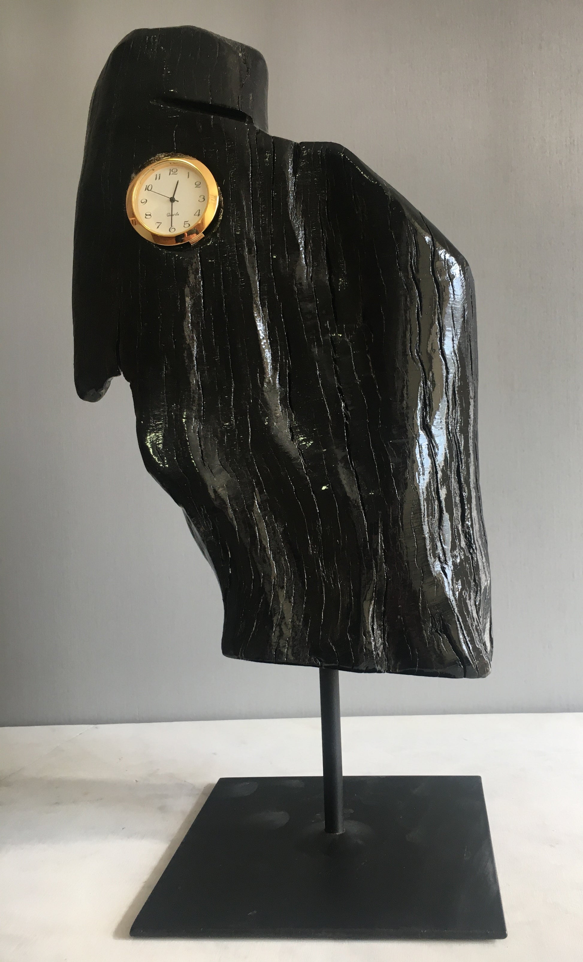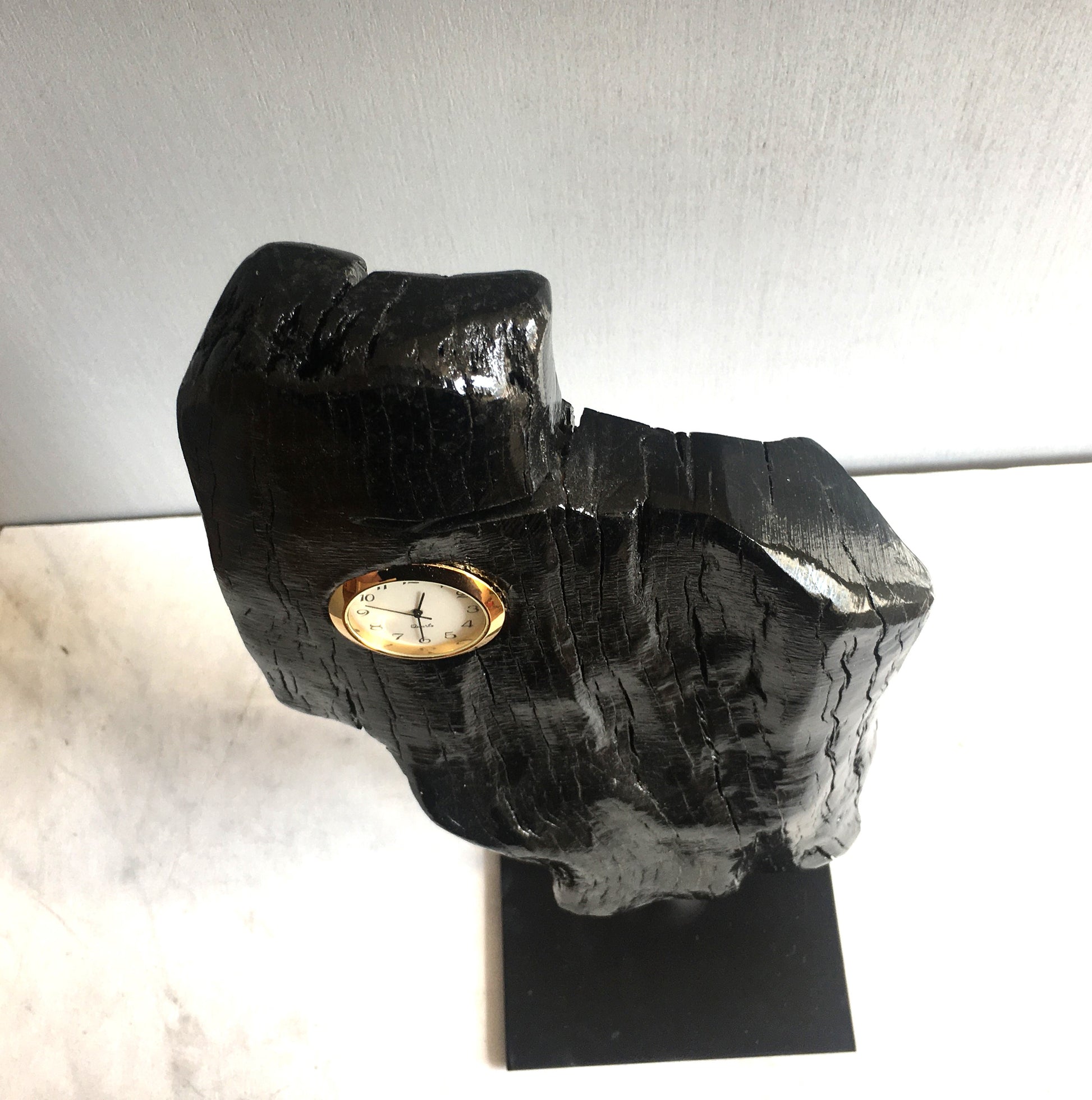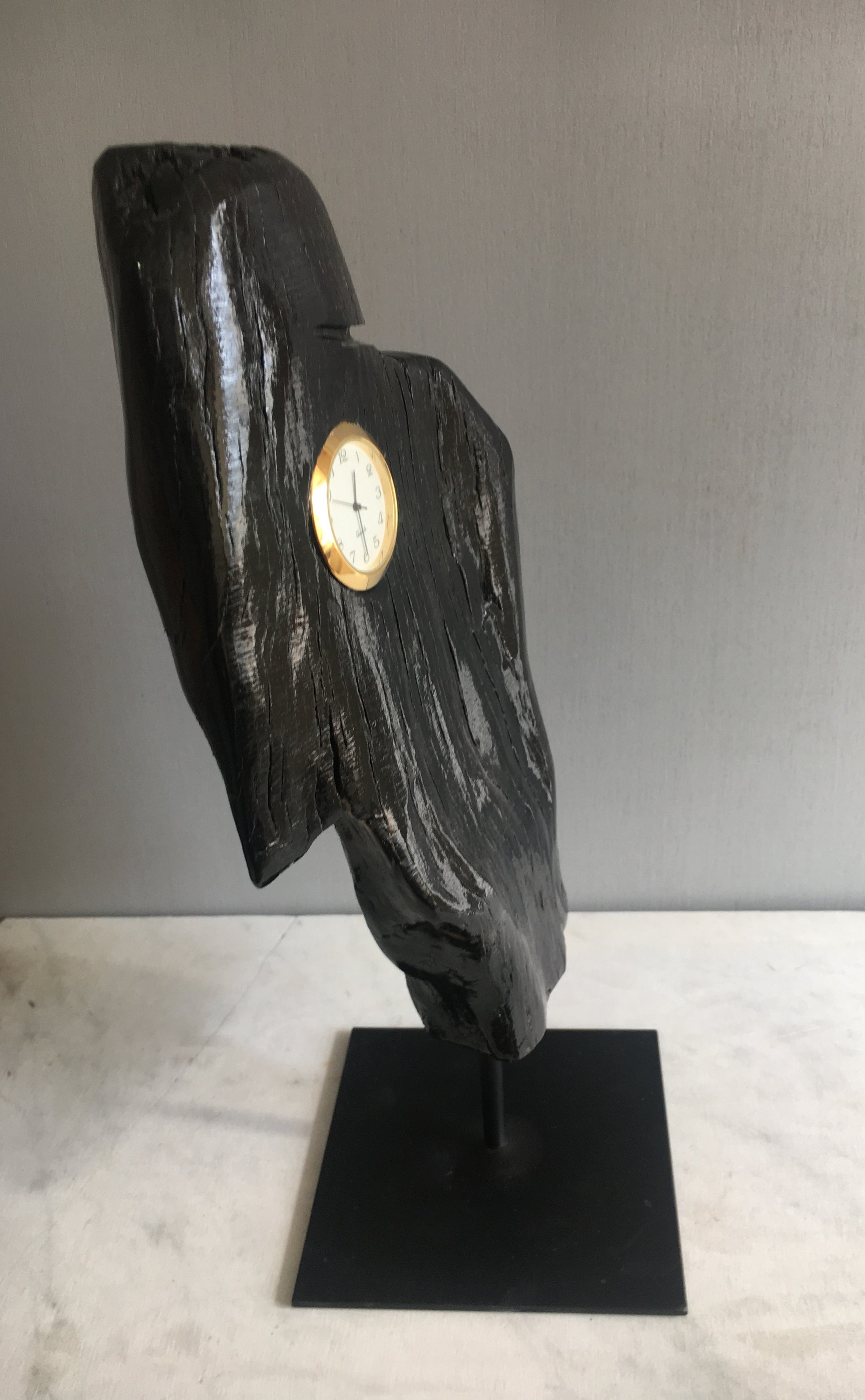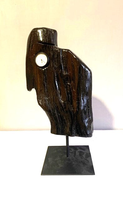 In a piece of bog wood thousands of years old, we insert a small clock to tell the time!
