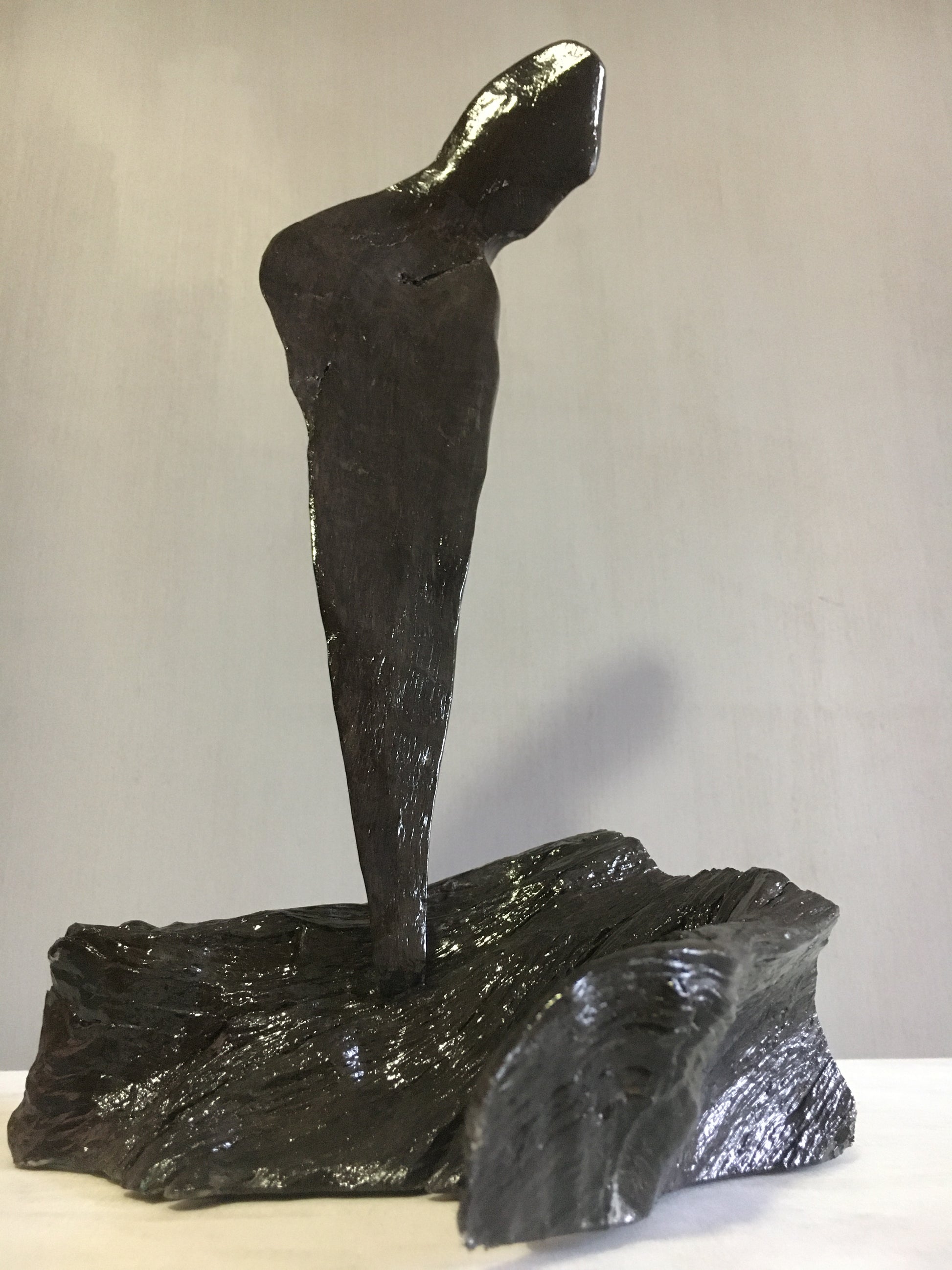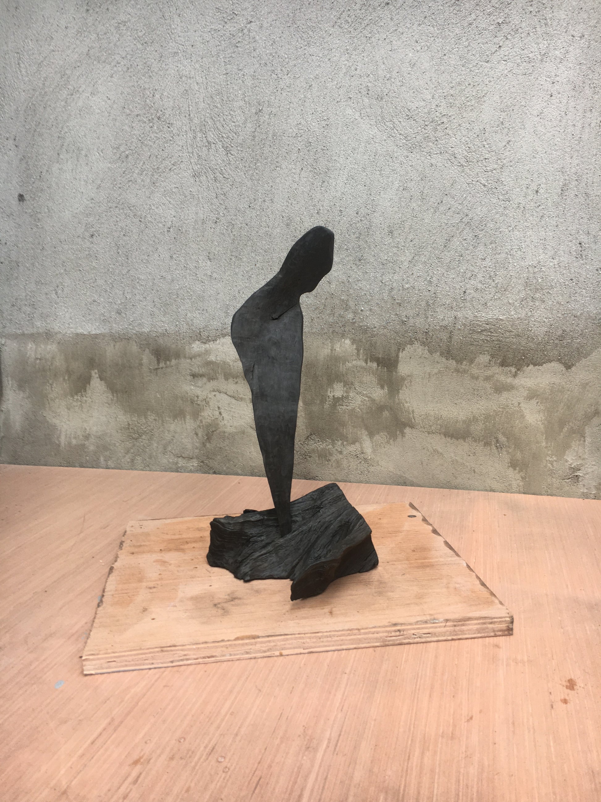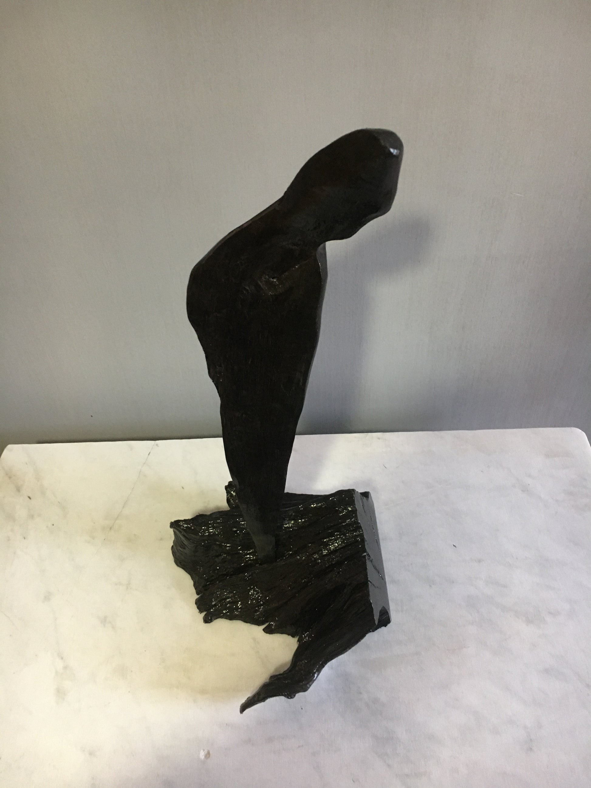 This piece of bog oak was stood vertically against the wall on the workbench and immediately I could see the outline of a man with hands behind his back looking down deep in thought, so I sculpted the head and back to enhance the leaning profile. The bog oak base with its natural rough grains, cracks and twists really compliment the overall piece.
