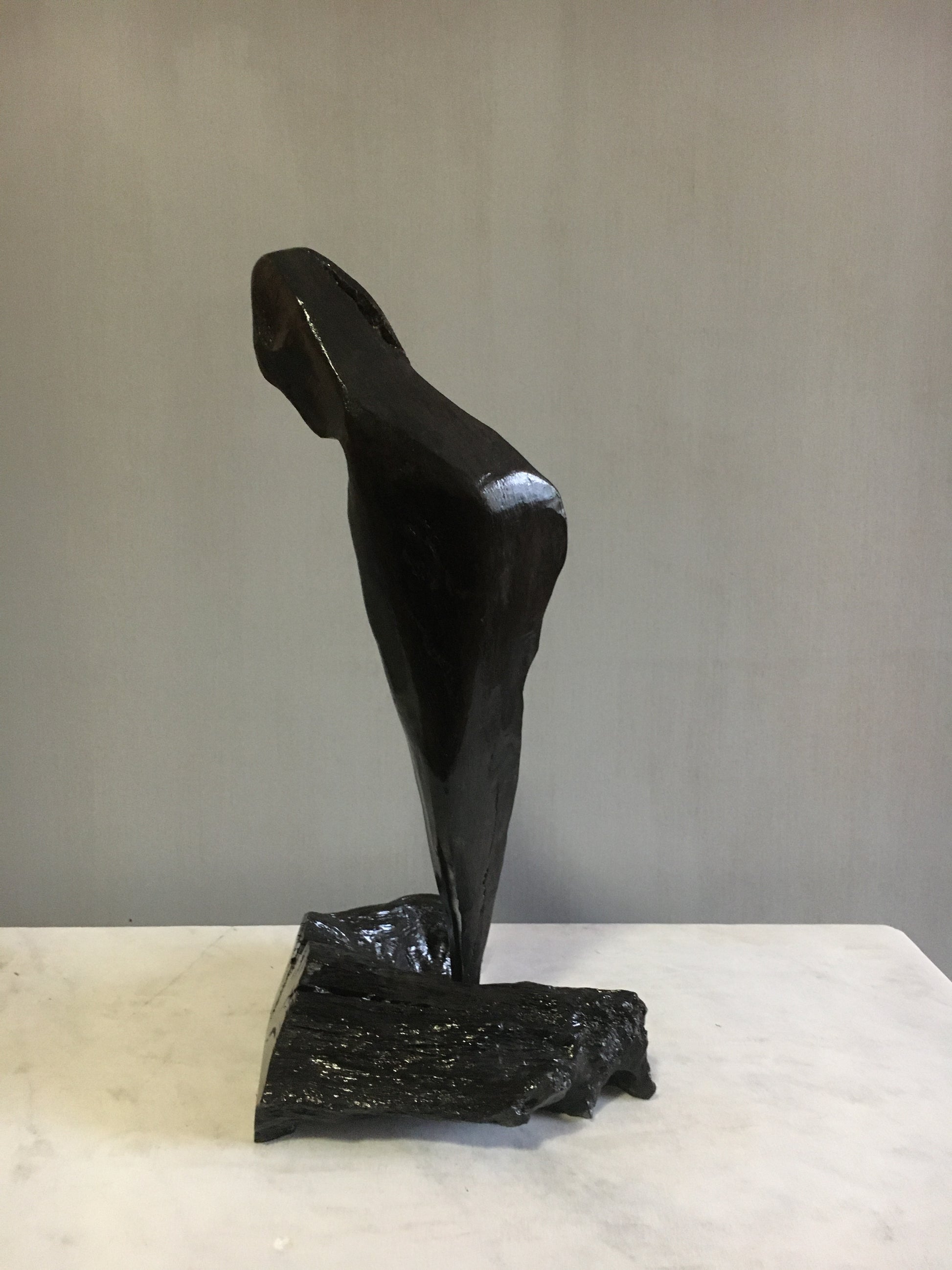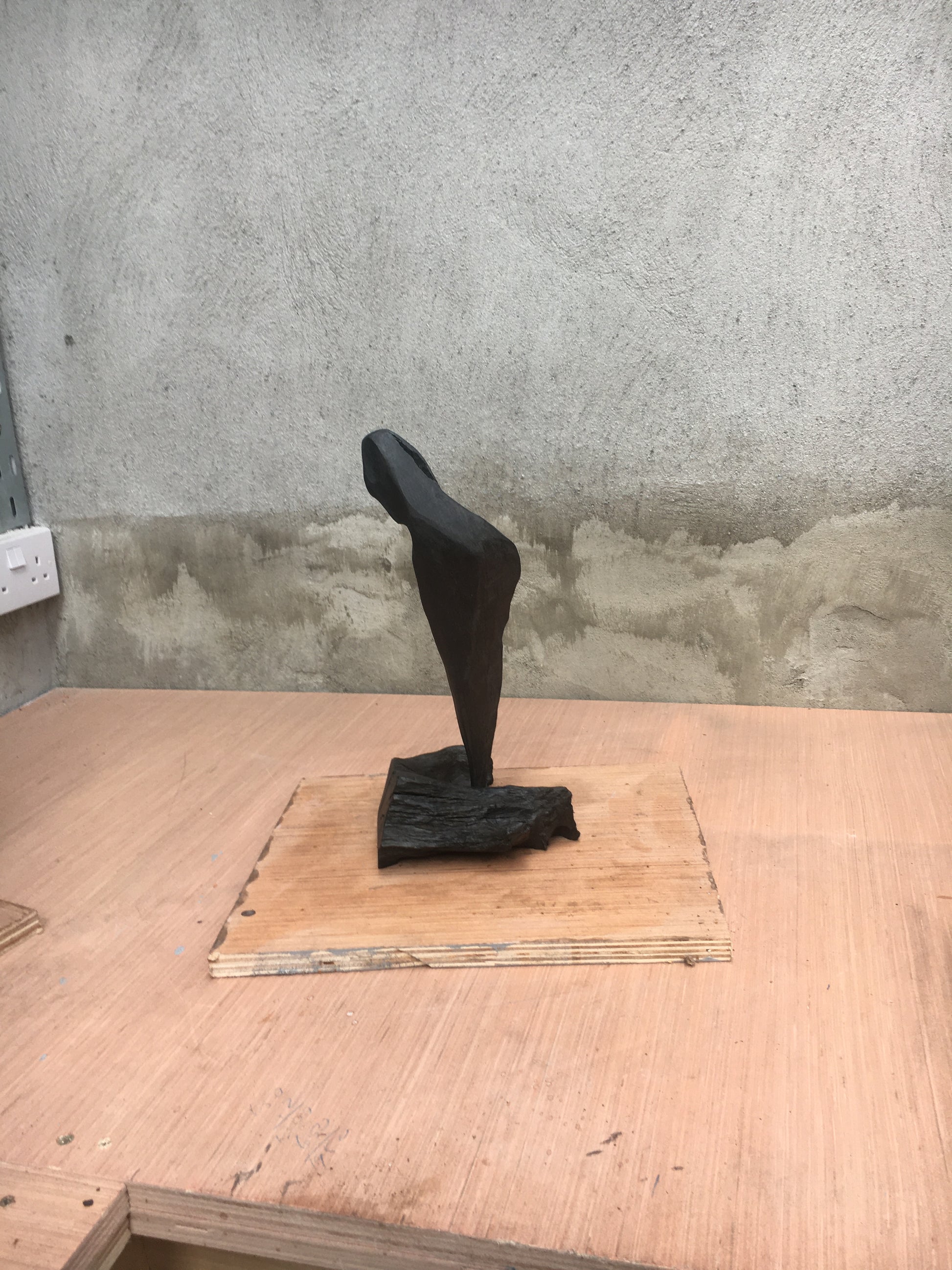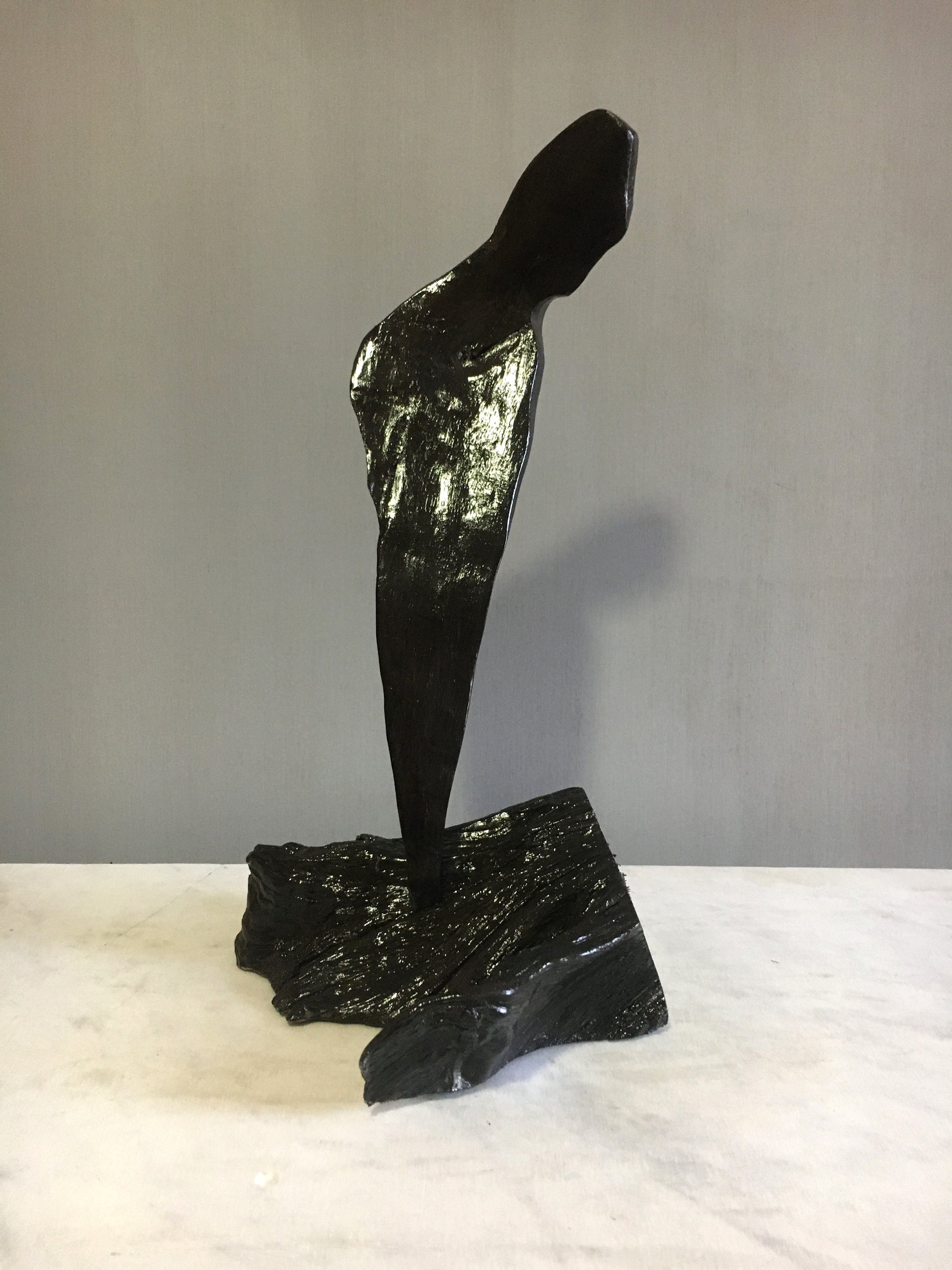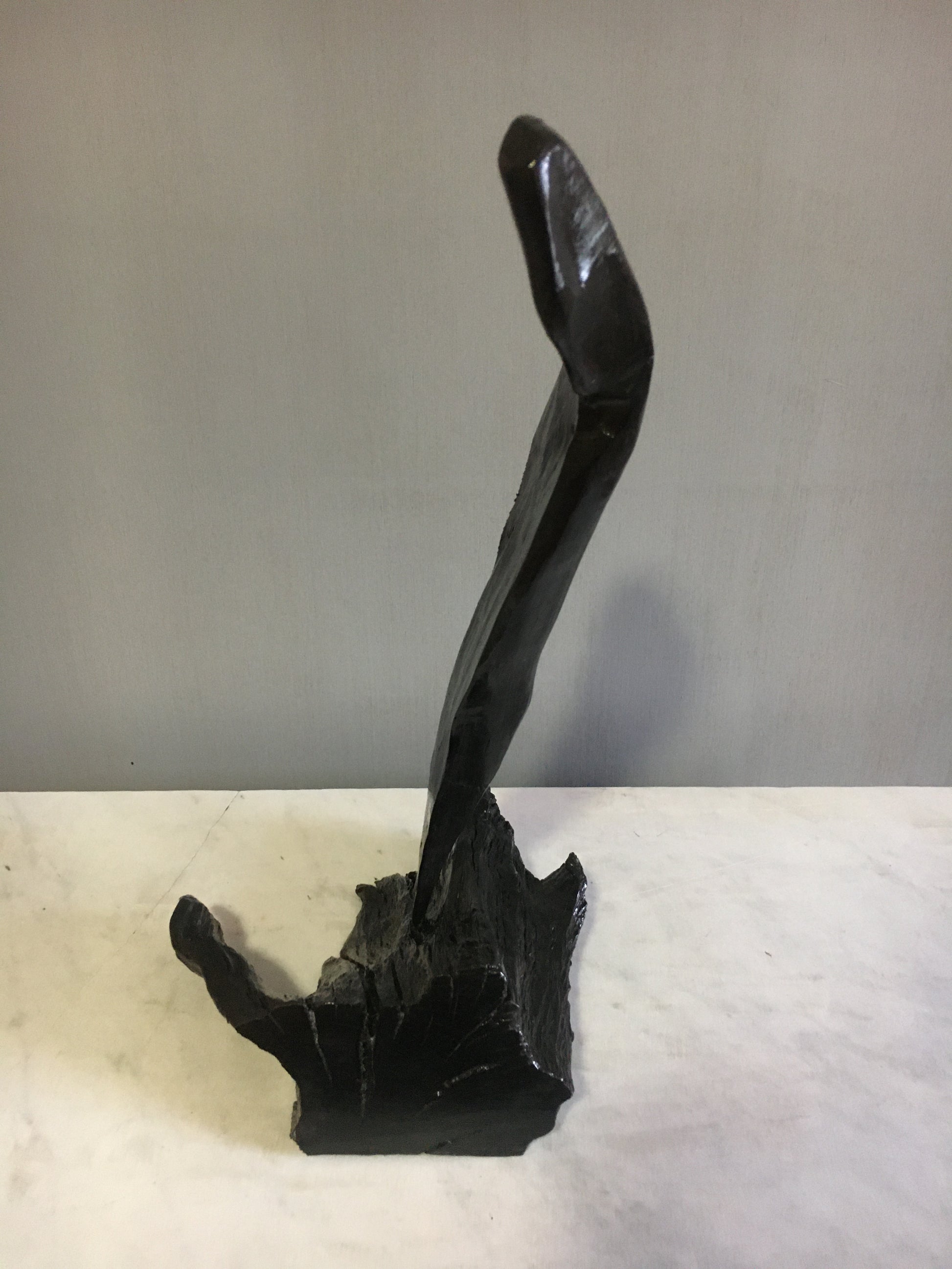 This piece of bog oak was stood vertically against the wall on the workbench and immediately I could see the outline of a man with hands behind his back looking down deep in thought, so I sculpted the head and back to enhance the leaning profile. The bog oak base with its natural rough grains, cracks and twists really compliment the overall piece.