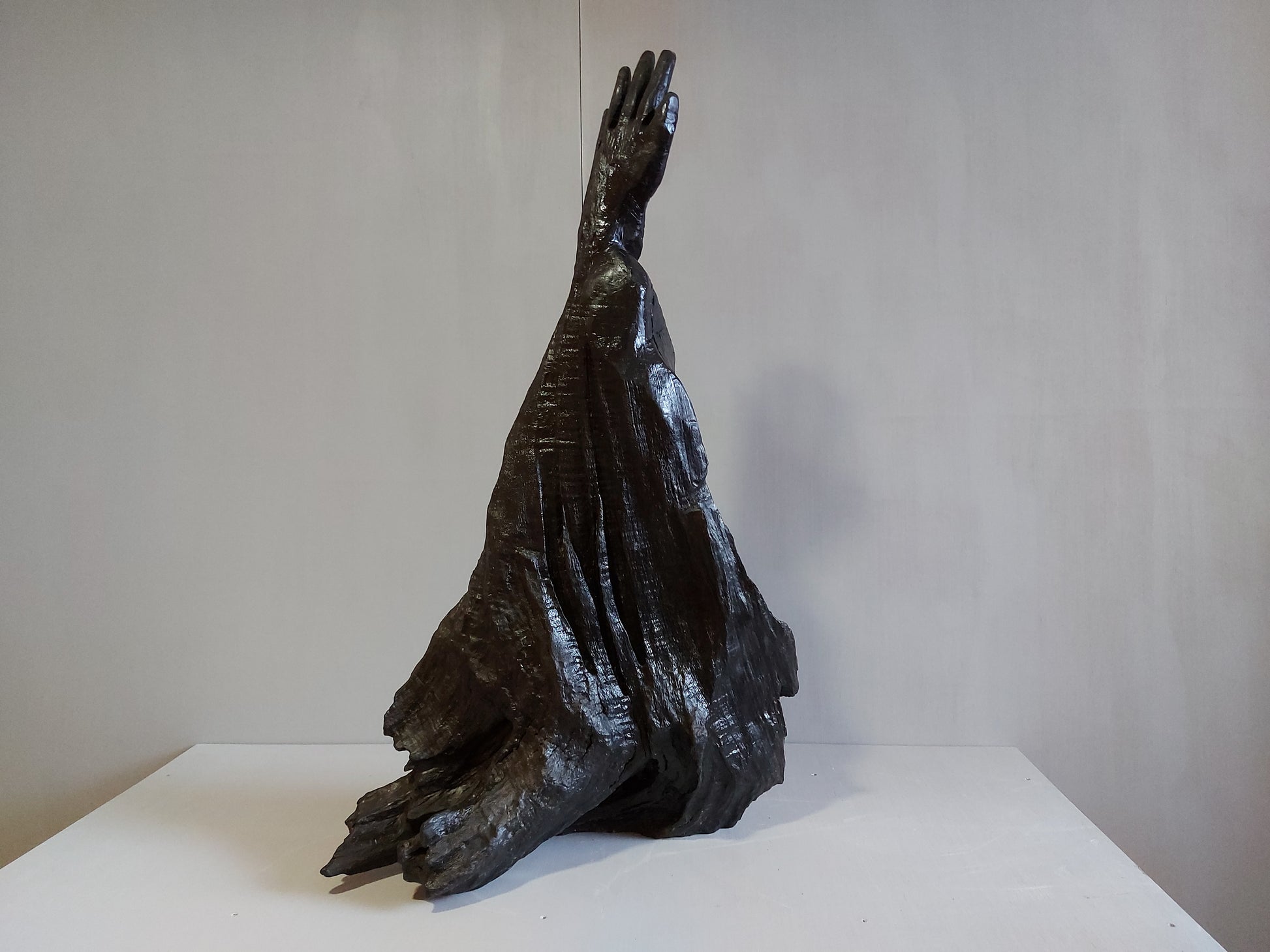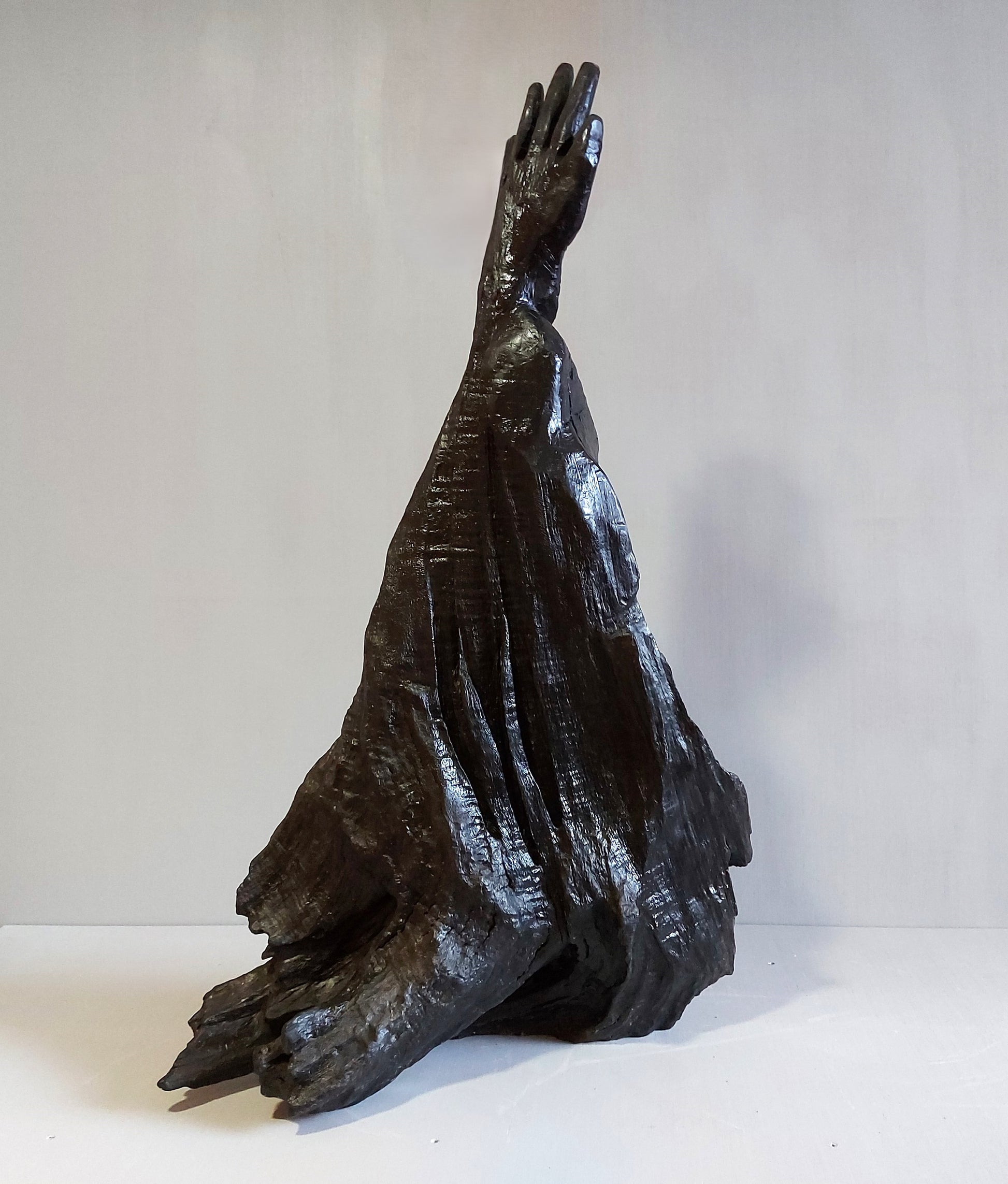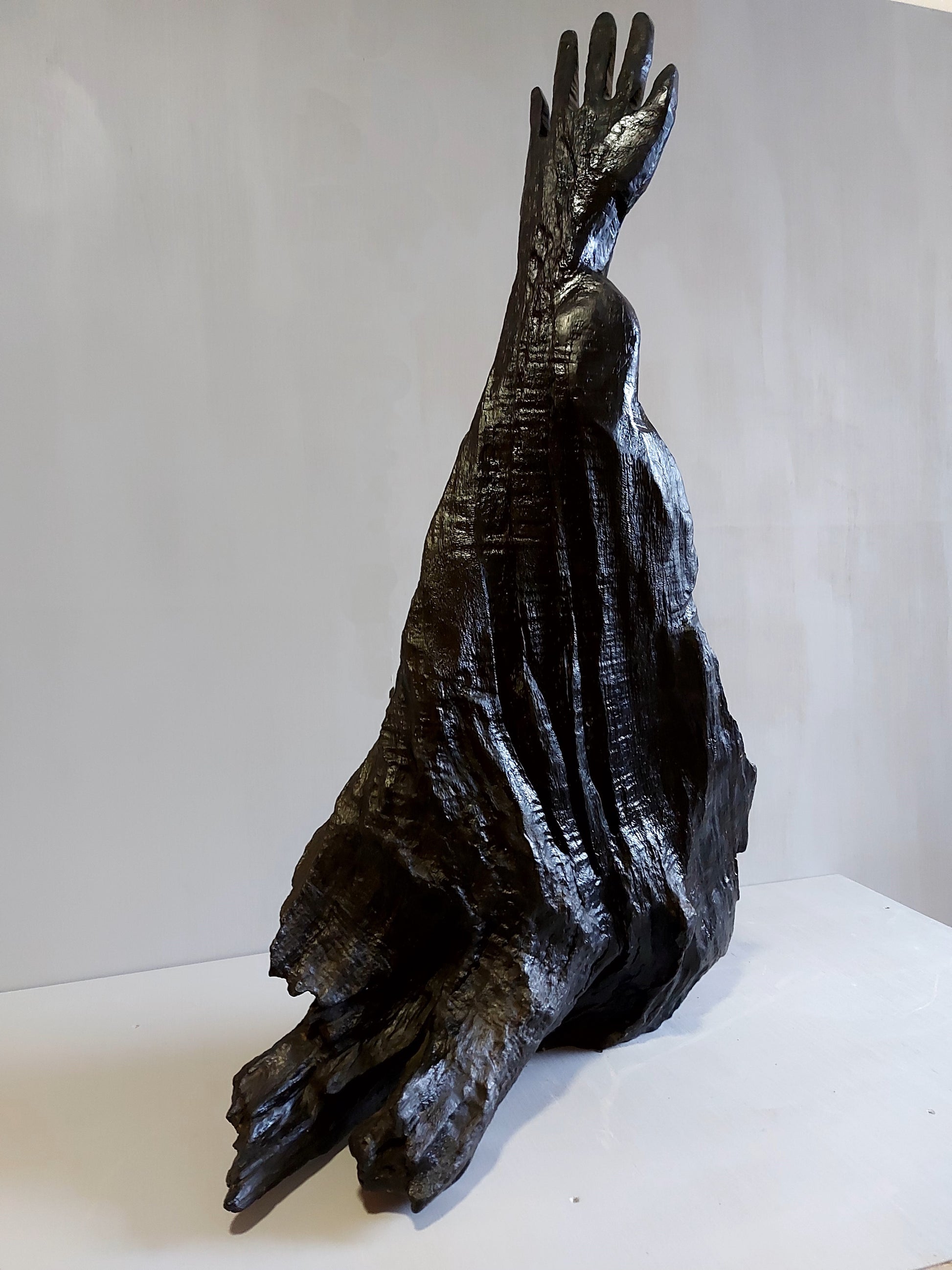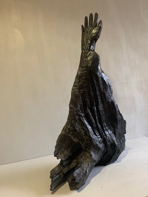 When I first saw this piece I could see immediately the outline of an arm stretching and reaching upwards out of the ground as if trying to grasp hold of something or someone. Except for cleaning and polishing, the arm and forearm remains as what emerged from the bog. I sculpted the hand from the wrist up. This bog oak is definitely the hardest and densest wood I have worked with and by far the most difficult to chisel and saw implying that this is the oldest wood I have worked with. The title “Why” is derived from an anti-war poster I recall seeing decades ago of a wounded soldier face down in the ground with his arm vertically outstretched and the poster was titled “Why”
